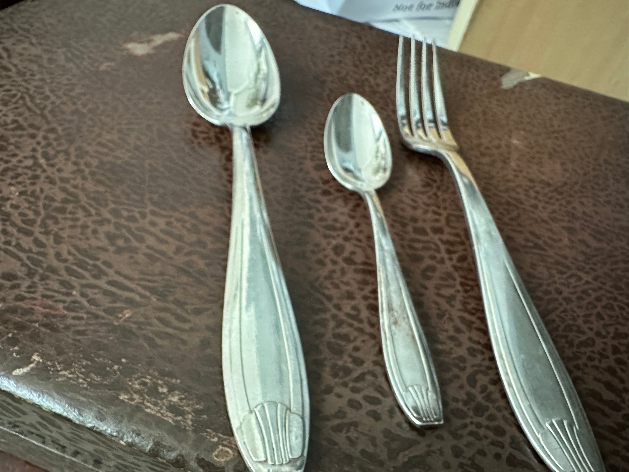 These are marked Apollo and the number 84 under a lion sitting down. I believe Apollo was the registered mark of Francois -frionnet of Paris. I wish you could feel this silverware. It is much heavier than your normal silverplate and is really beautiful. The identification of this comes only from my research and could be wrong. I also believe this is the original box and is missing a ladle.
