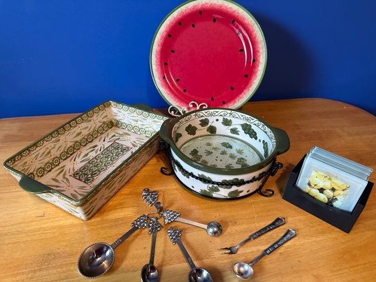 2 casseroles, one round with glass bottom & metal holder, one retangular; 4 glass coasters with holder; watermelon plate; measuring spoons; 2 olive spoons one for green ; one for black