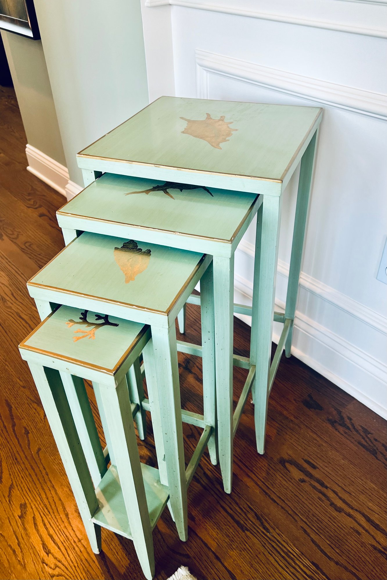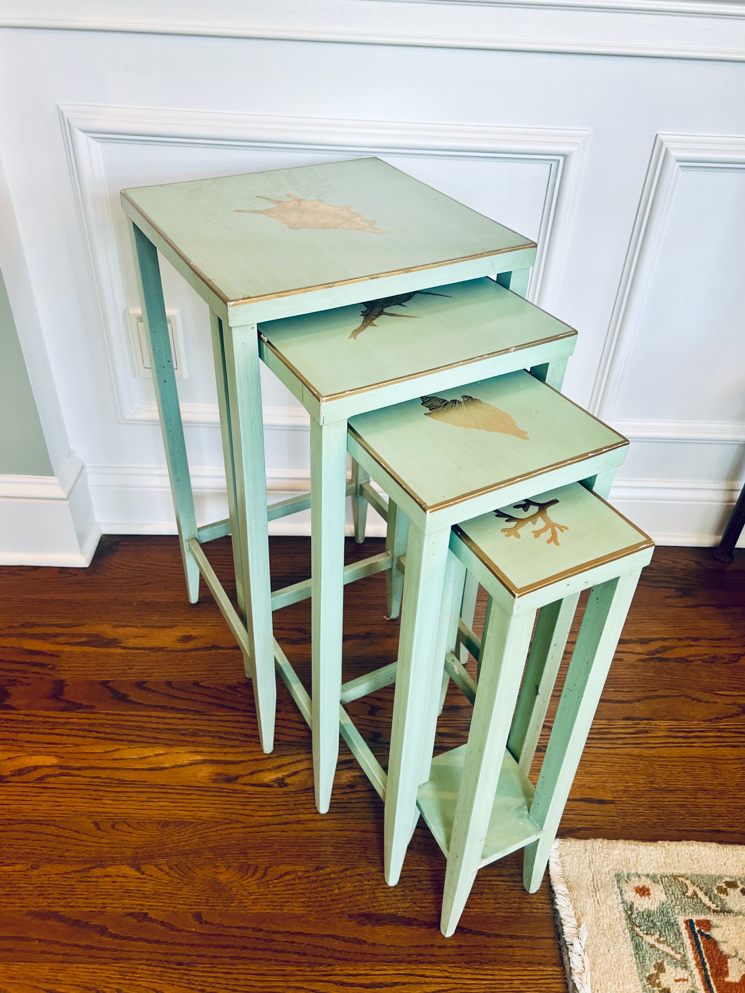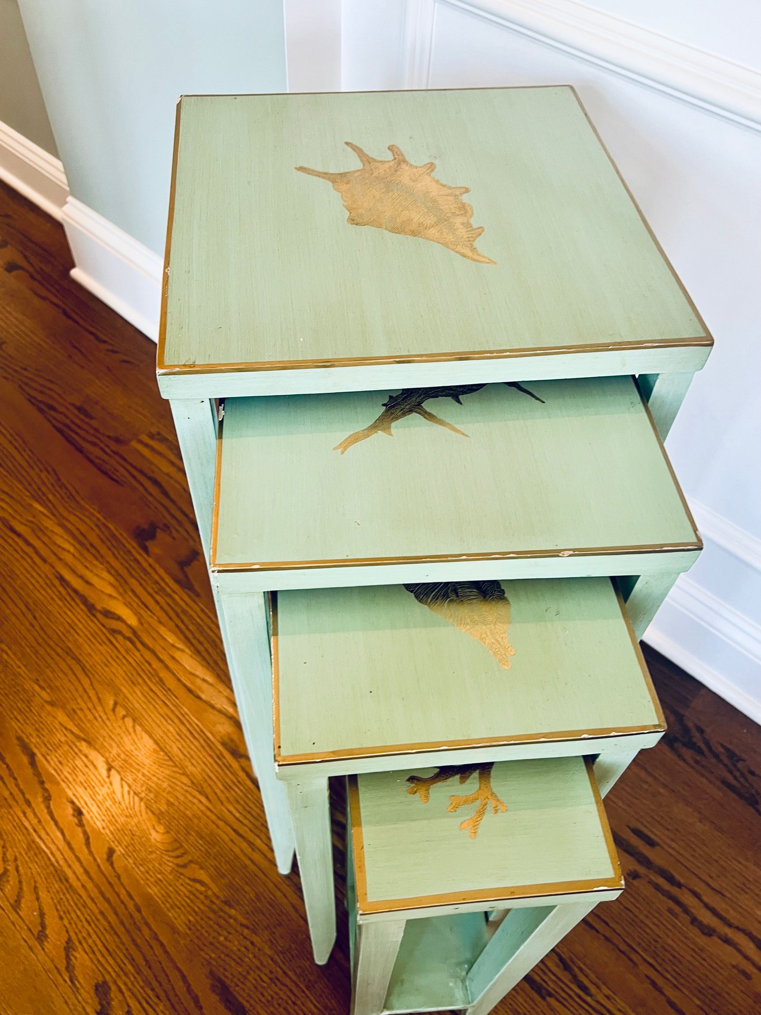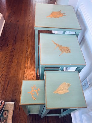 Adorable set of 4 nesting tables in a painted robins egg blue with gold accent top and border detailing with coastal motifs. With a few nics but utterly special.