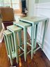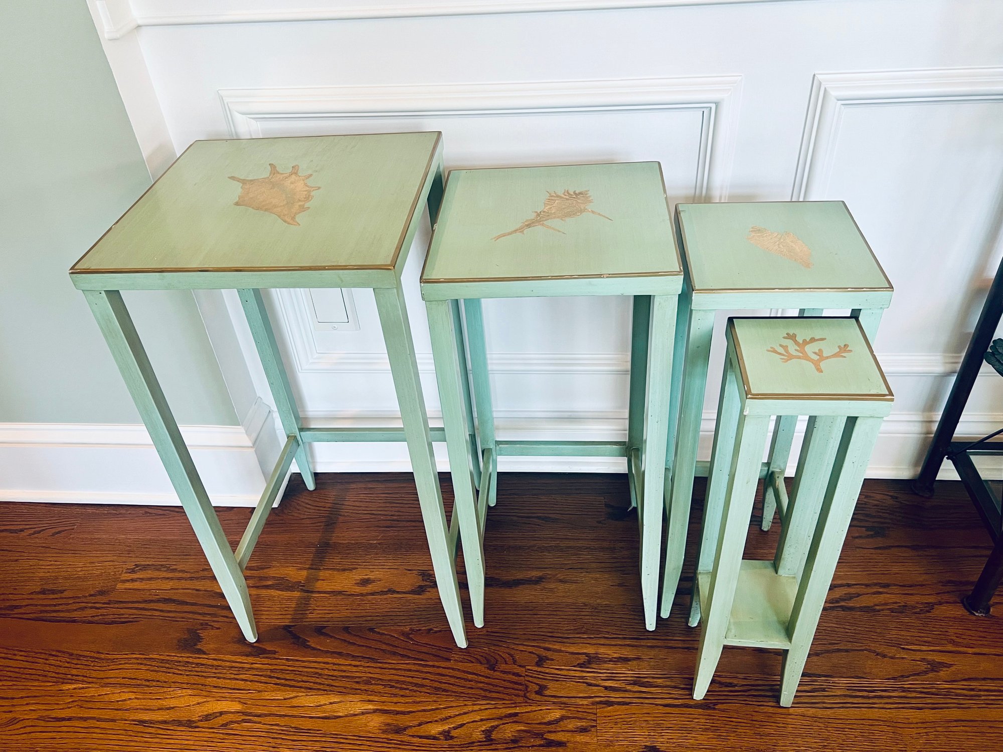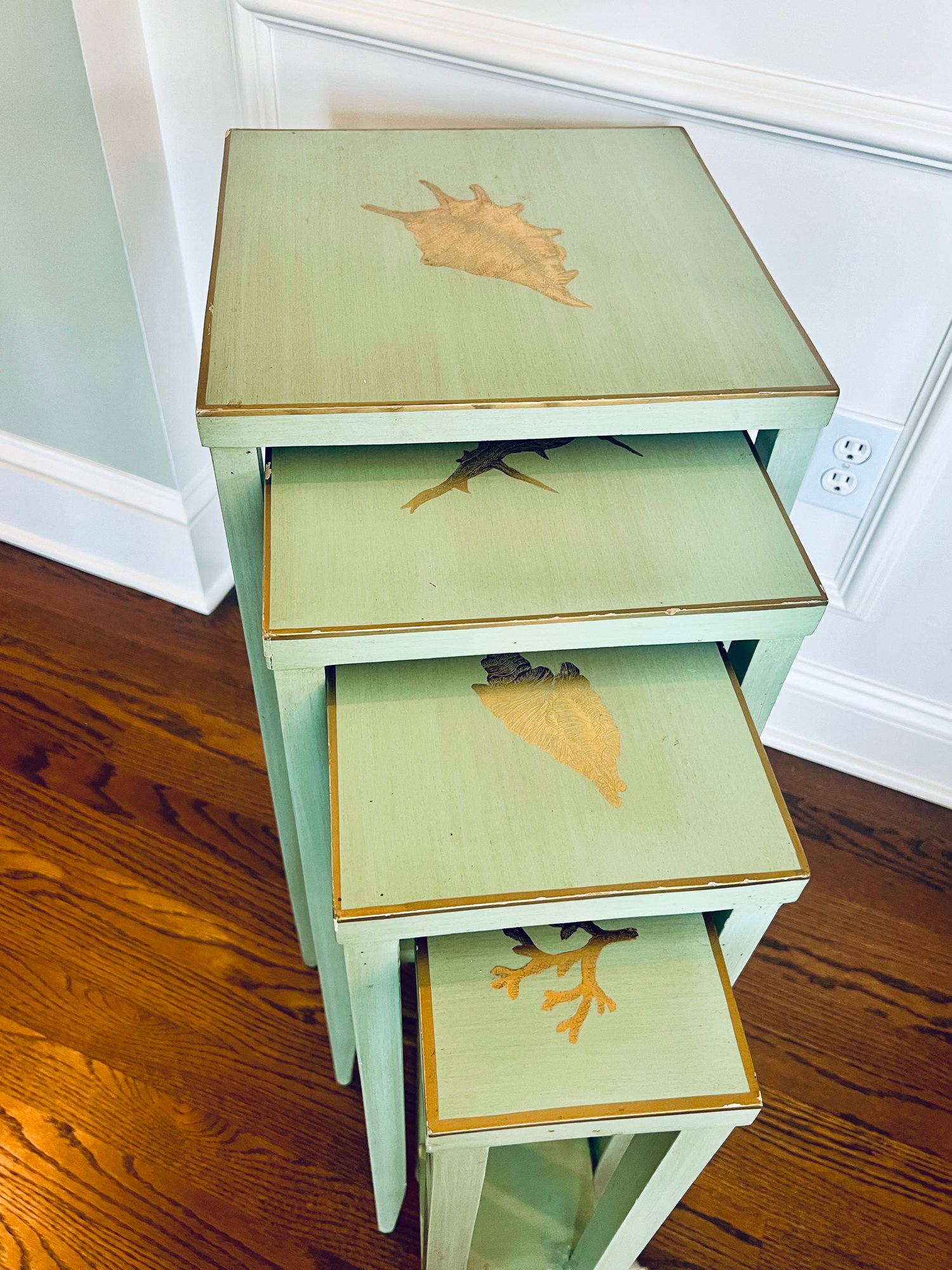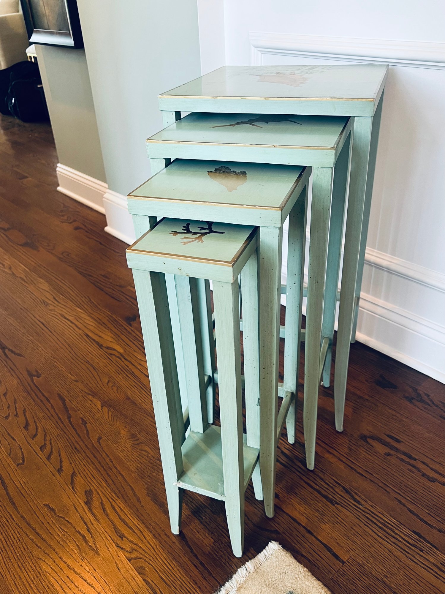 Adorable set of 4 nesting tables in a painted robins egg blue with gold accent top and border detailing with coastal motifs. With a few nics but utterly special.