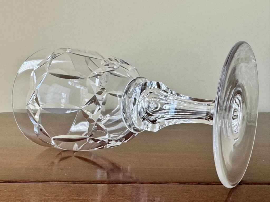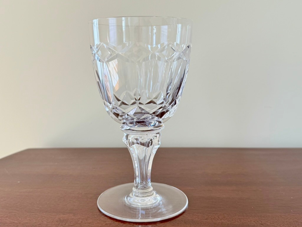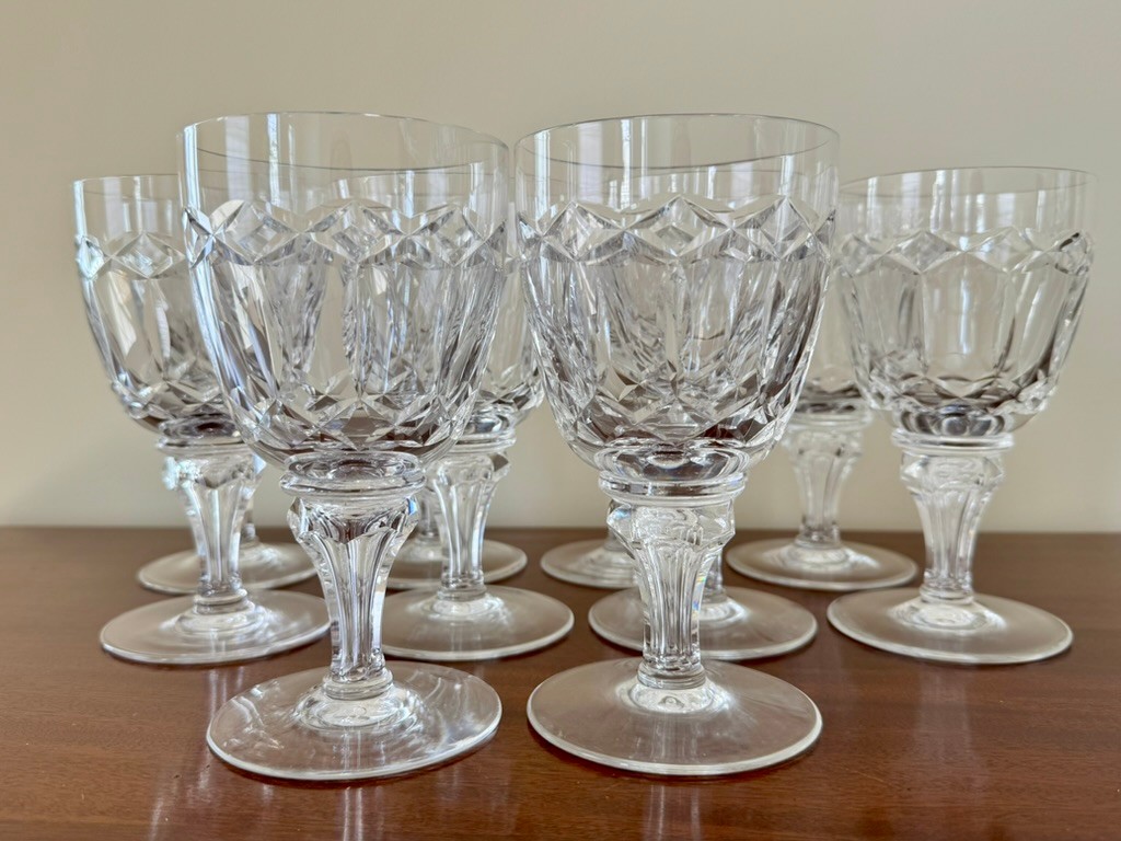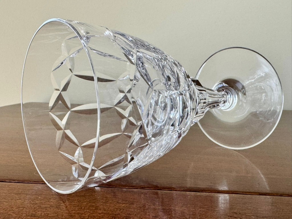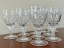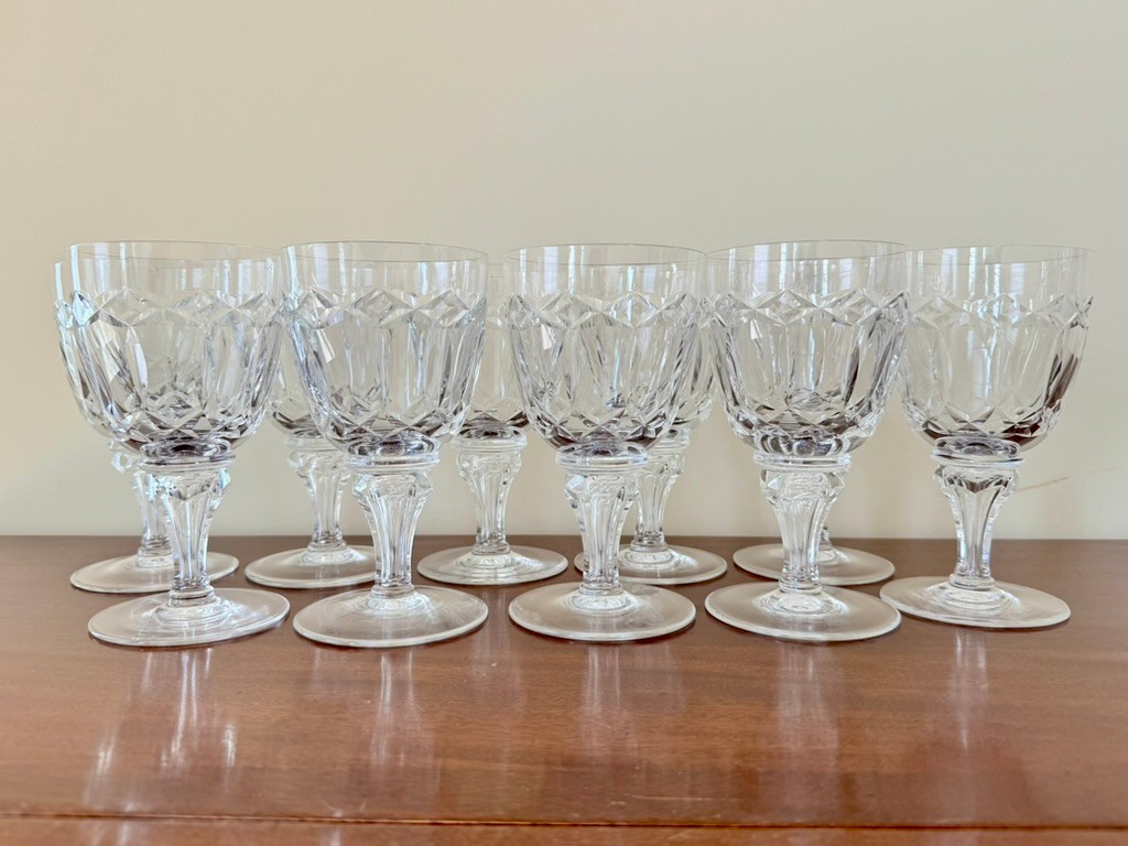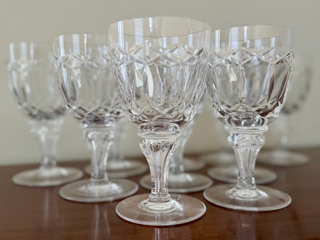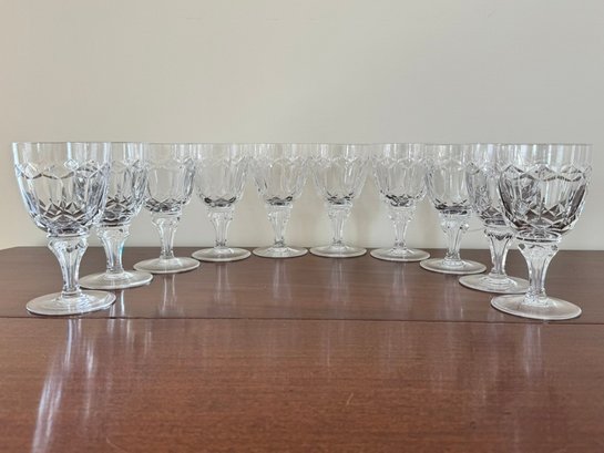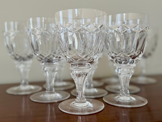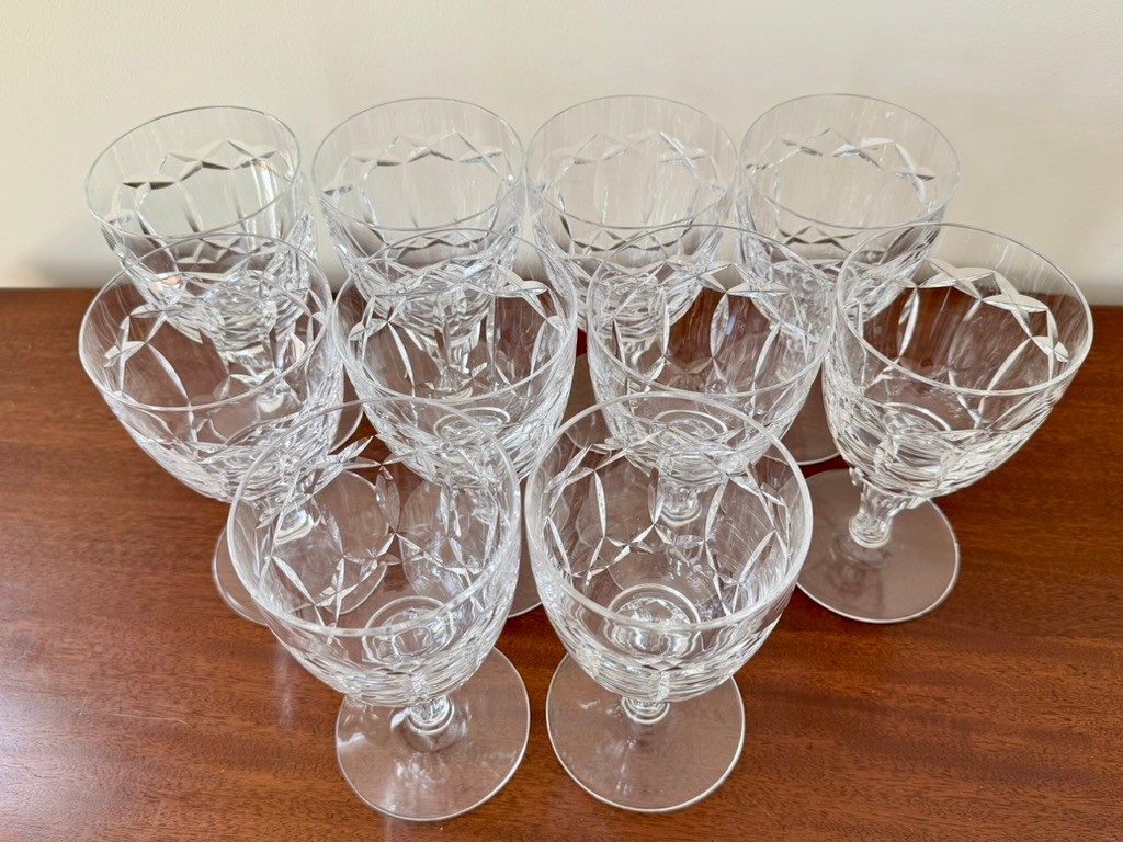 Features a criss-cross cut pattern on the bowl and a faceted stem with a knob. Ten 6 1/2" tall water glasses.