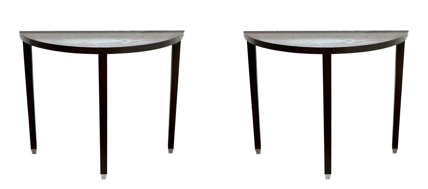 Refined simplicity at its best! Elevate your entryway or living space with these sleek black textural wood grain demi-lune console tables. Their half-moon shape offer a refined, space-saving silhouette, perfect for hallways, foyers, or as chic display surfaces. Crafted with a rich, dark wood finish, the console tables with tapered legs and silver capped feet, balances contemporary minimalism with timeless sophistication. Whether adorned with décor or left uncluttered for a clean aesthetic, these pieces bring effortless elegance to any home. A versatile beauty for any décor!