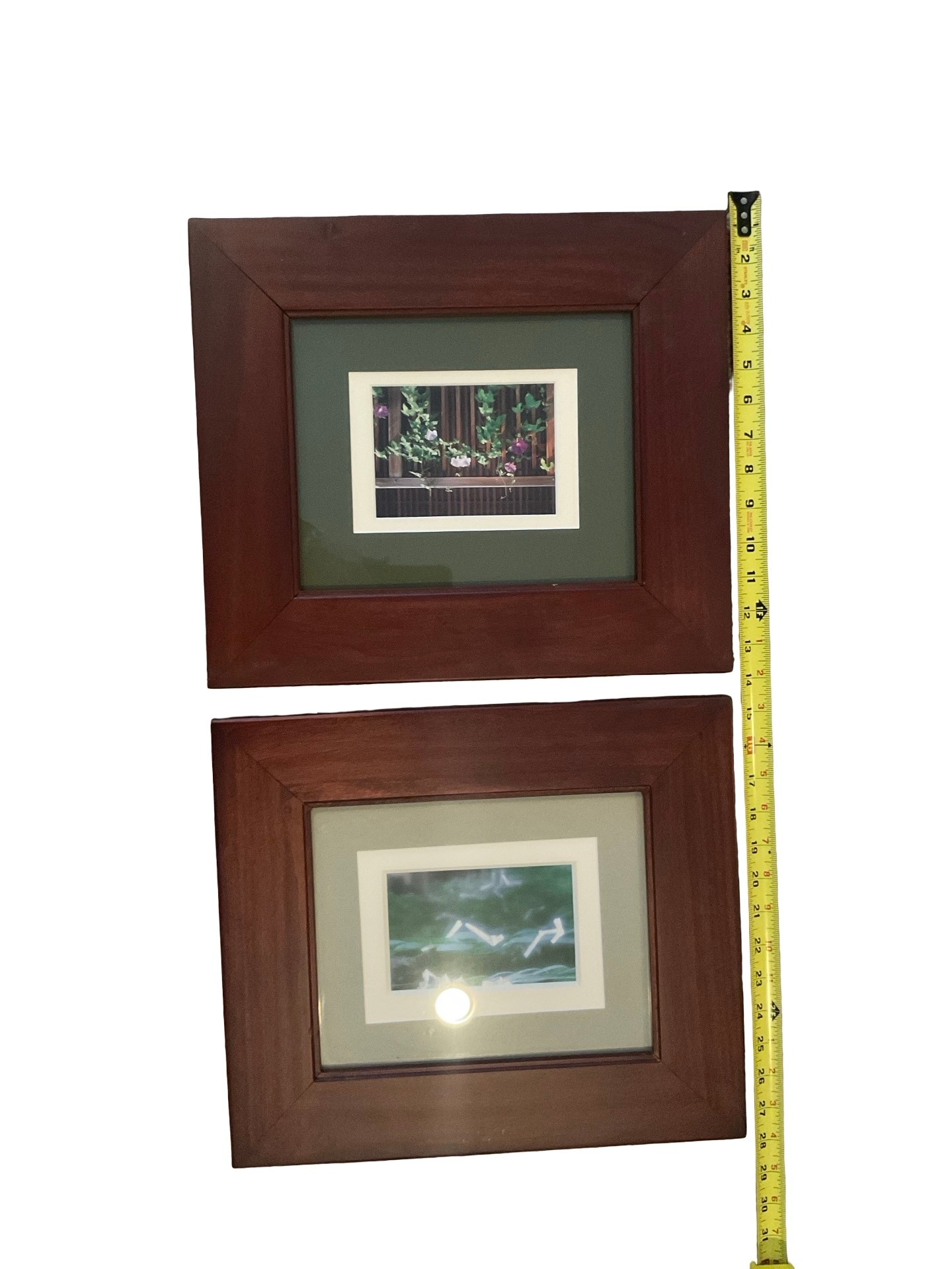 Subject: Pair of nature-inspired prints featuring floral garden scenes and soft-focus water reflections.