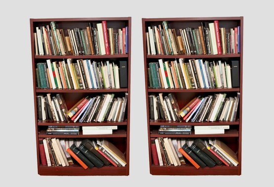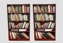 Set of 2 Large-scale wall of modular open bookcases in a rich reddish-brown wood veneer (likely mahogany or cherry tone), composed of multiple matching sections joined side-by-side to create a built-in library effect. Each unit features evenly spaced adjustable shelves, simple crown molding along the top, and recessed vertical stiles that create a paneled rhythm across the span. Clean, traditional lines make this suitable for library, study, or living room display. Books are not included.