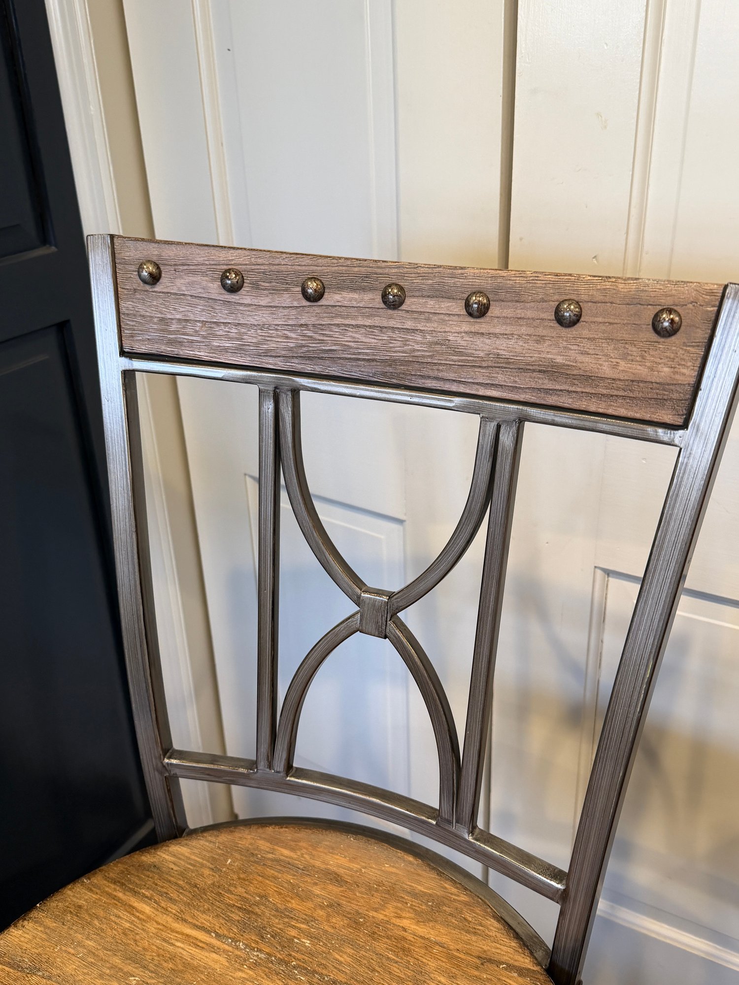 Wood seat, brushed steel and nail head details