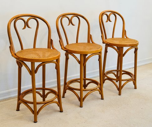 Set of 3 - mid-century modern bar stools crafted from bentwood after Thonet. The stools feature a classic heart motif back crafted from gracefully curved beech. The seat has woven cane inset and is supported by long straight legs conjoined by round and curved stretchers. The lower ring stretcher serves as a footrest with a seat height of 29.5 inches high. Each chair is stamped on bottom "made in Romania" .