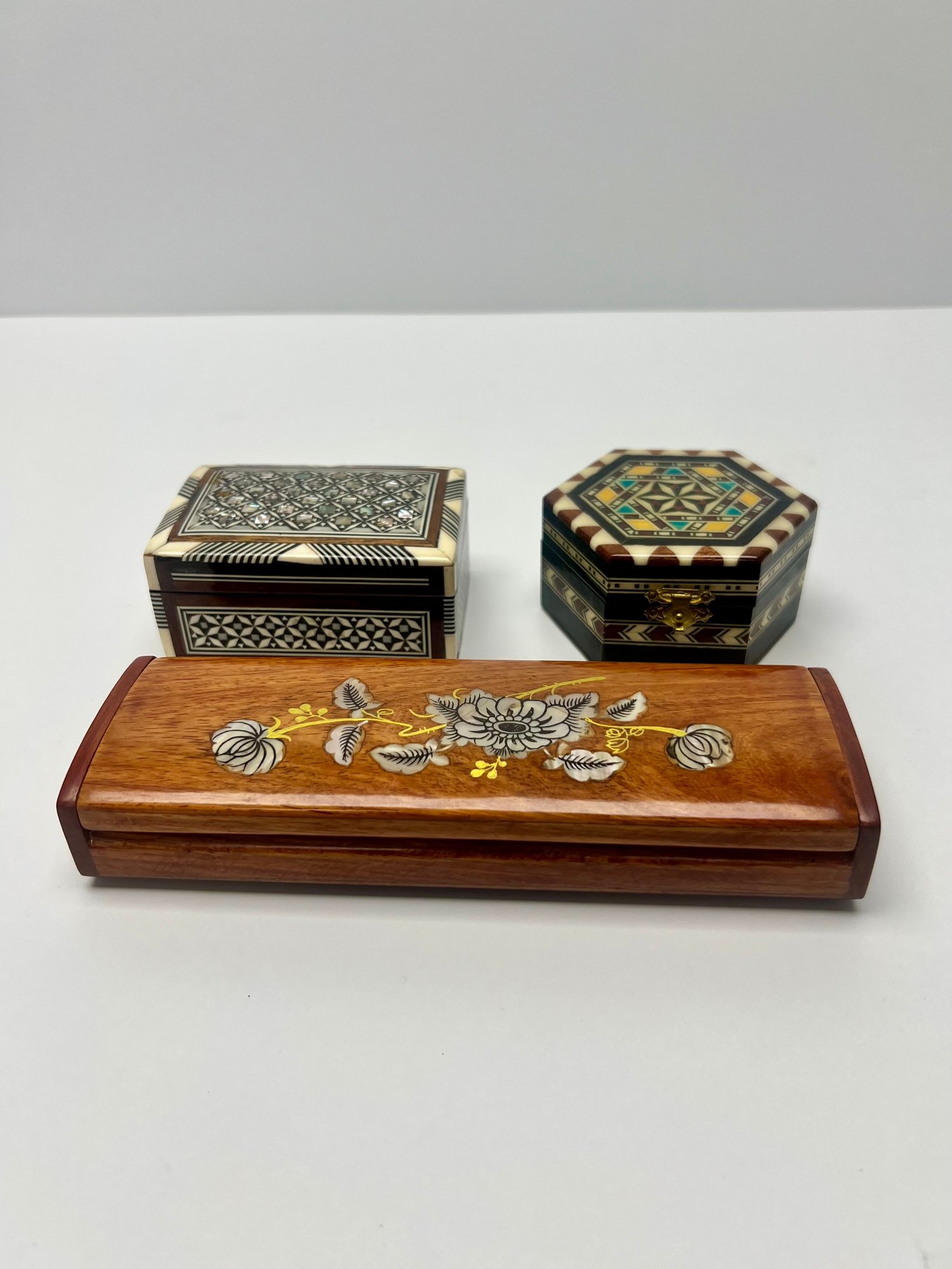 Beautiful set of three wooden inlaid boxes, ideal for decorative storage, keepsakes, or display. Each features a unique shape and size: