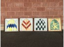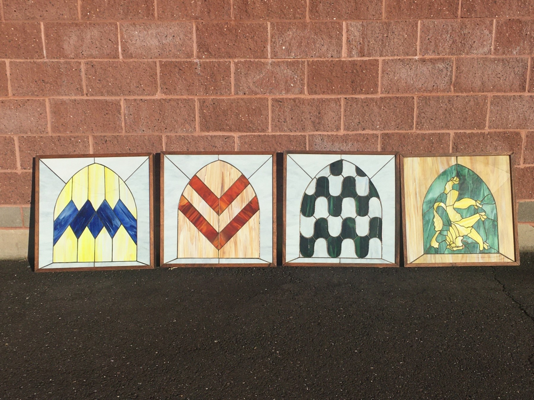Each is 25x25". 2 windows have a small crack, 2 windows have several large cracks. Not perfect, but still a great display piece. These are antique pieces, not new.