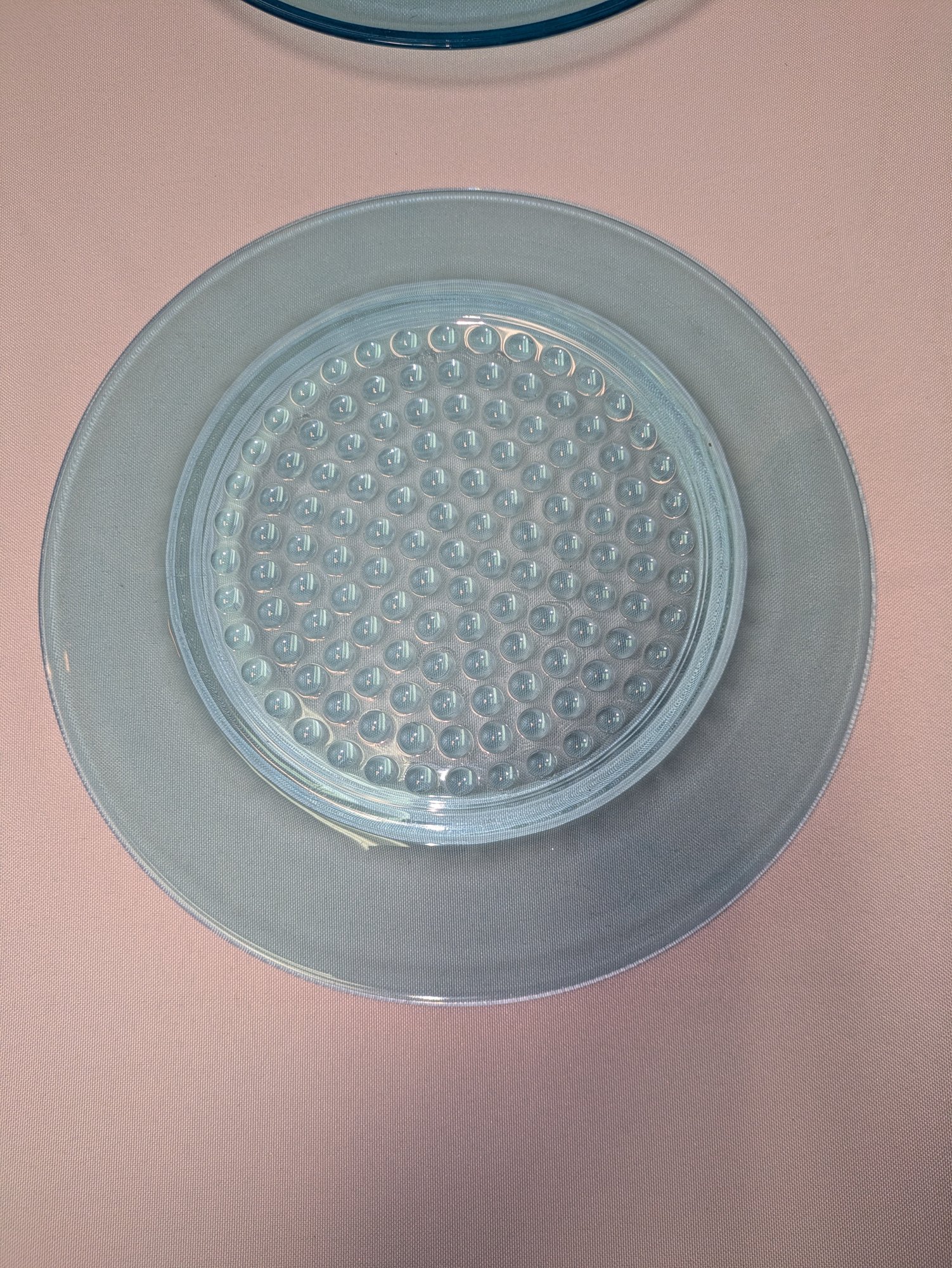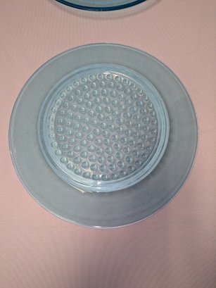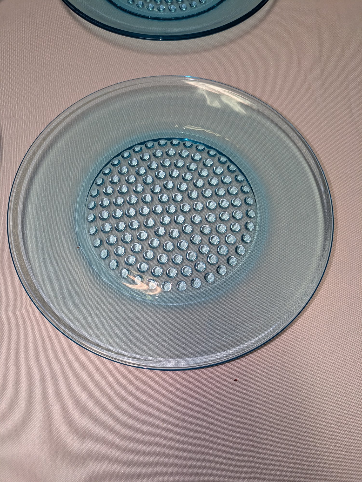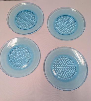 Stunning turquoise clothing with a hobnail button design pattern. Very light utensil marks, consistent with age and use. Overall, Excellent/Very Good Vintage Condition. 10"Diam.