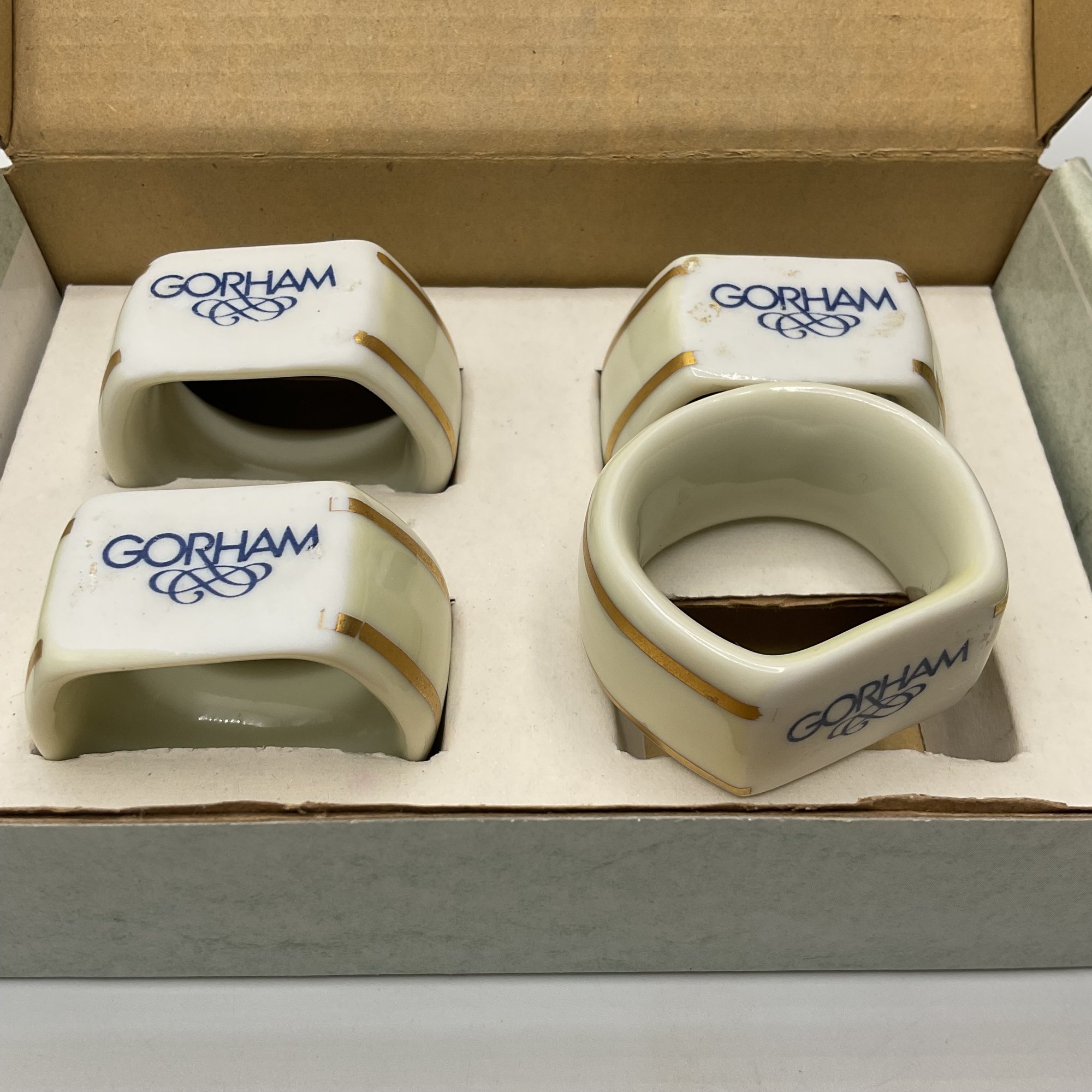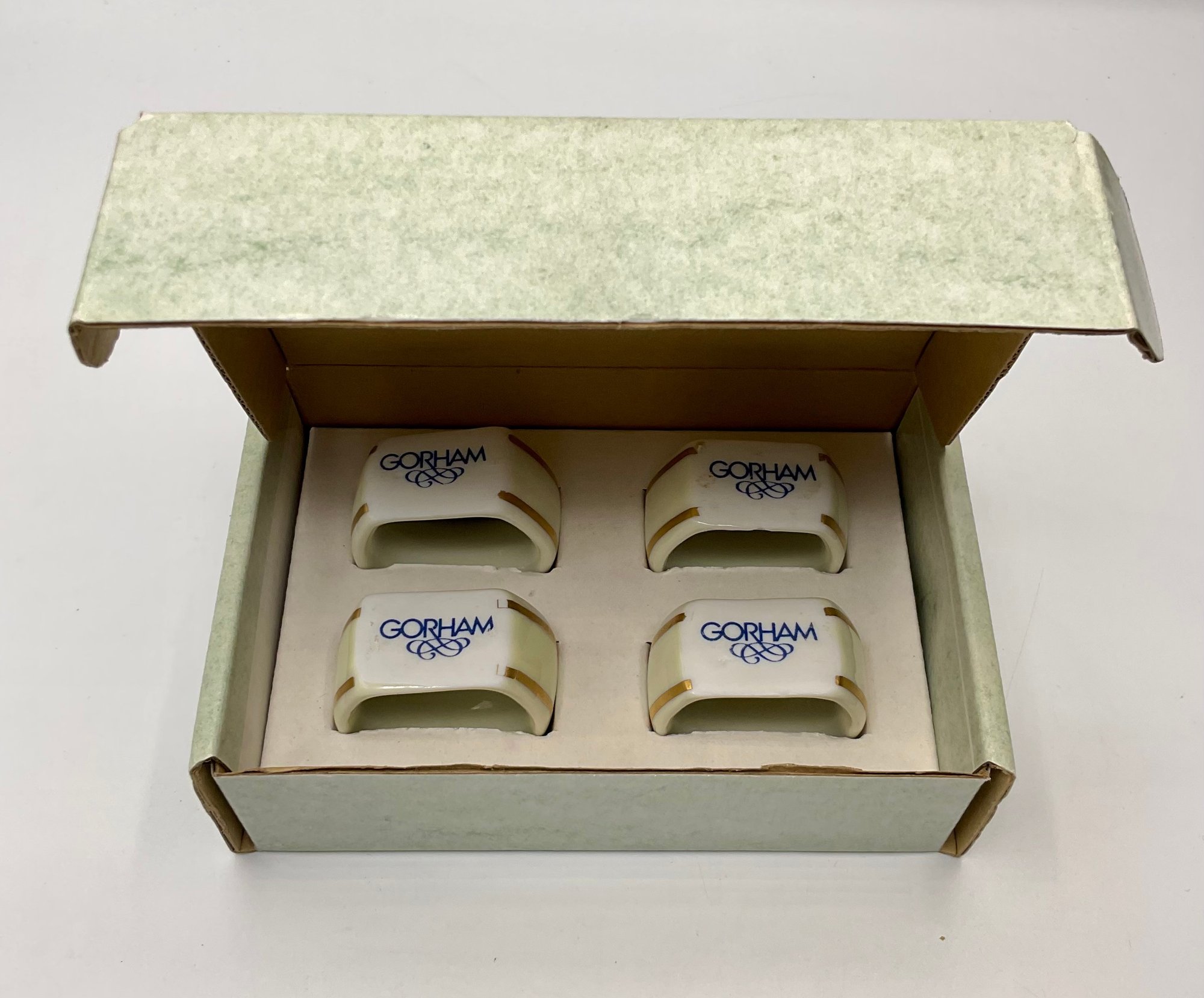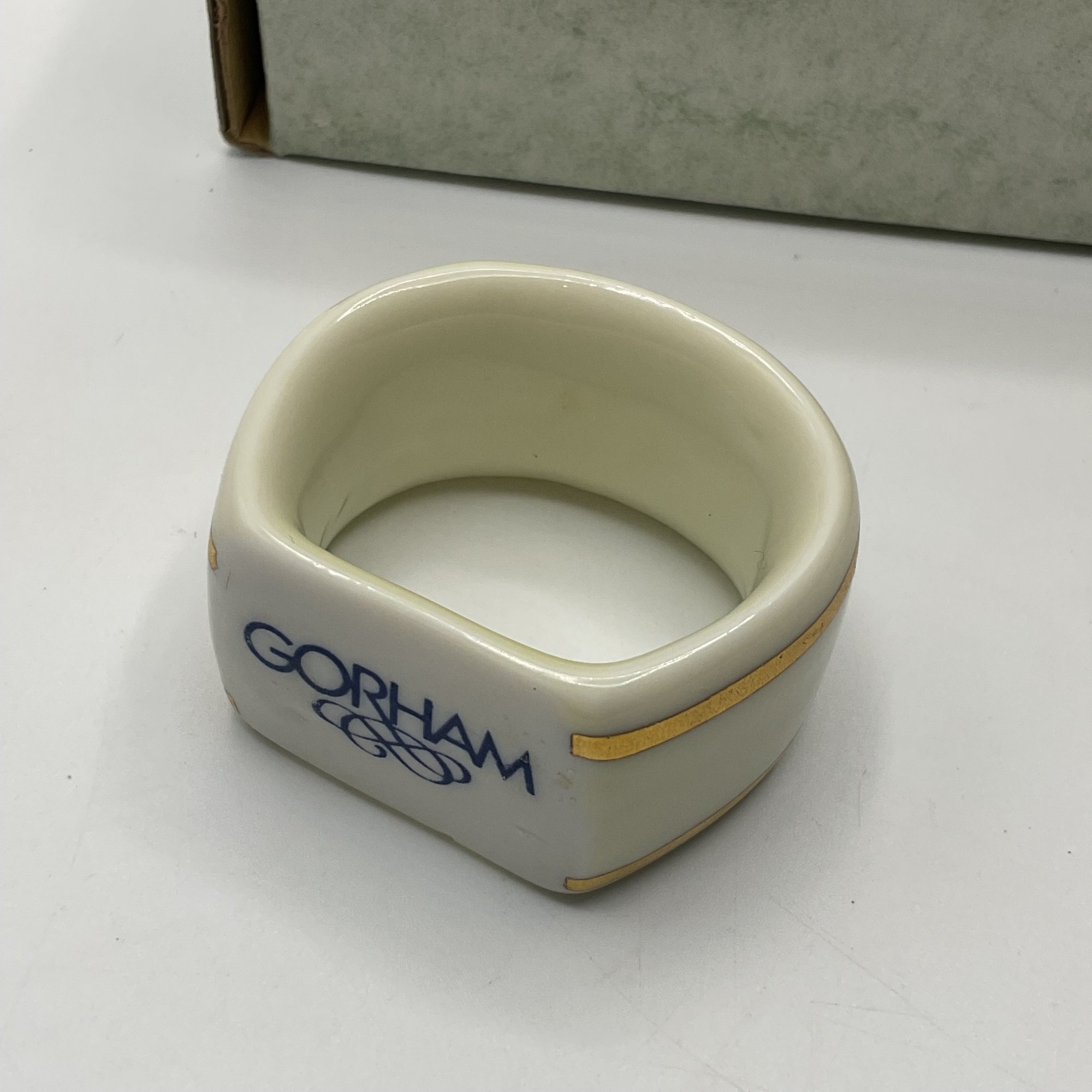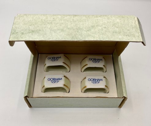 This is a beautiful set of four Gorham Fine China napkin rings, presented in their original 4-inch branded display box. Each piece features a classic ivory porcelain finish accented with elegant double gold bands and the distinctive blue Gorham scroll logo.