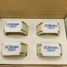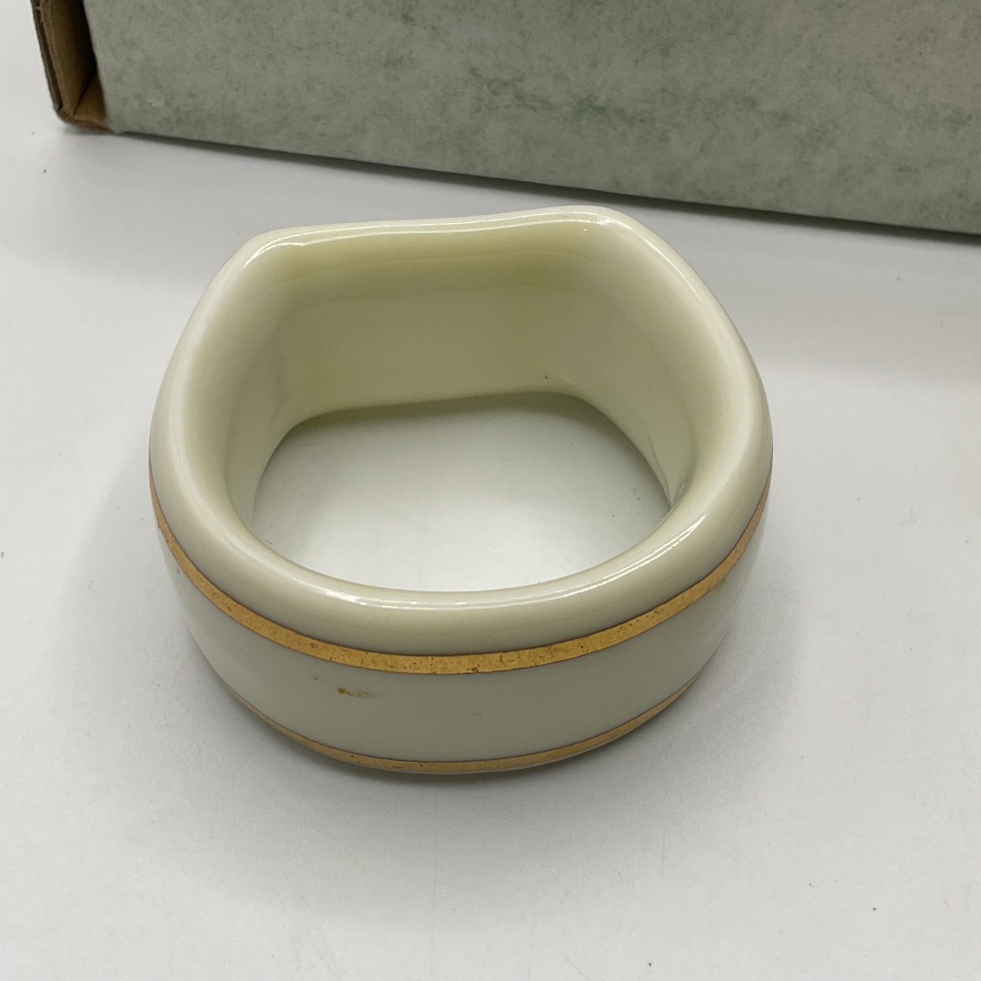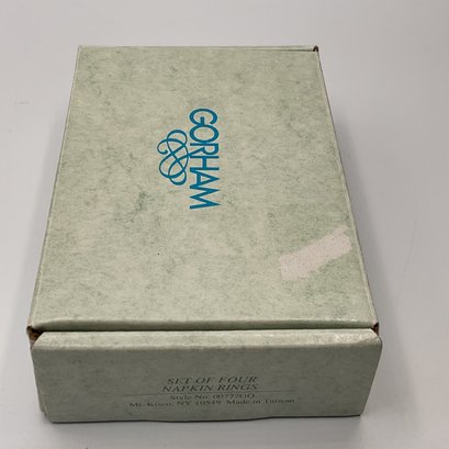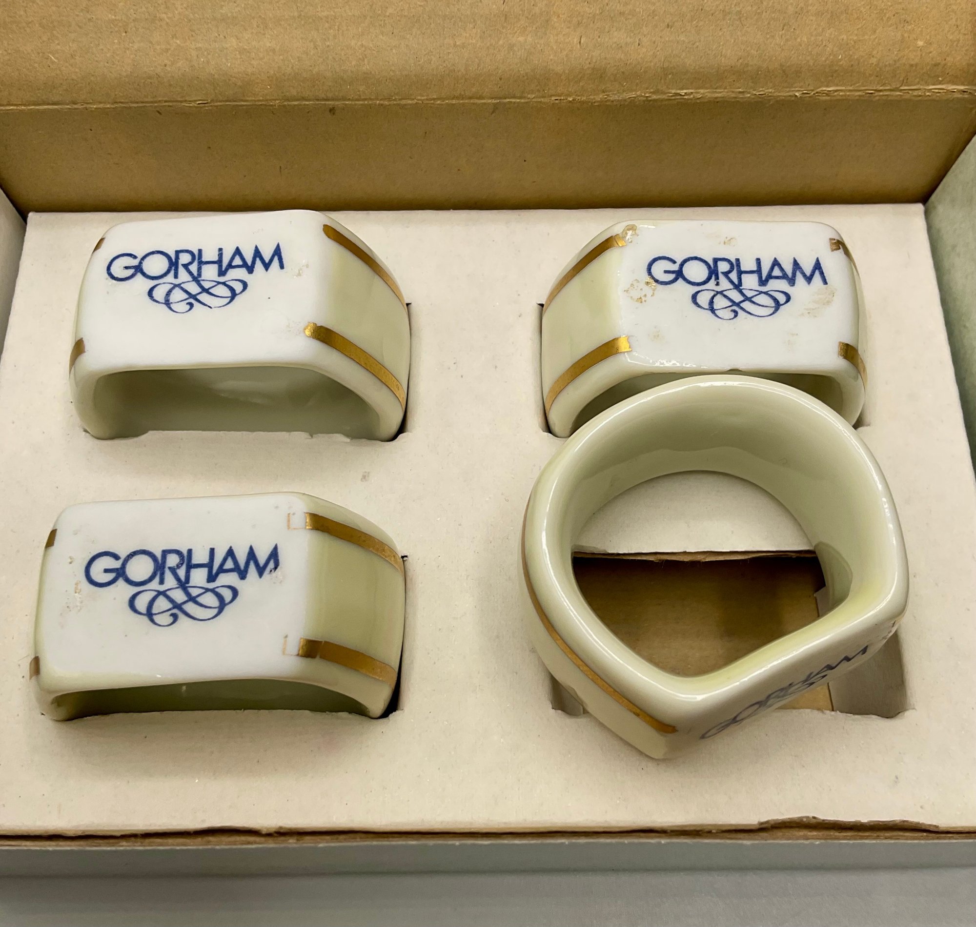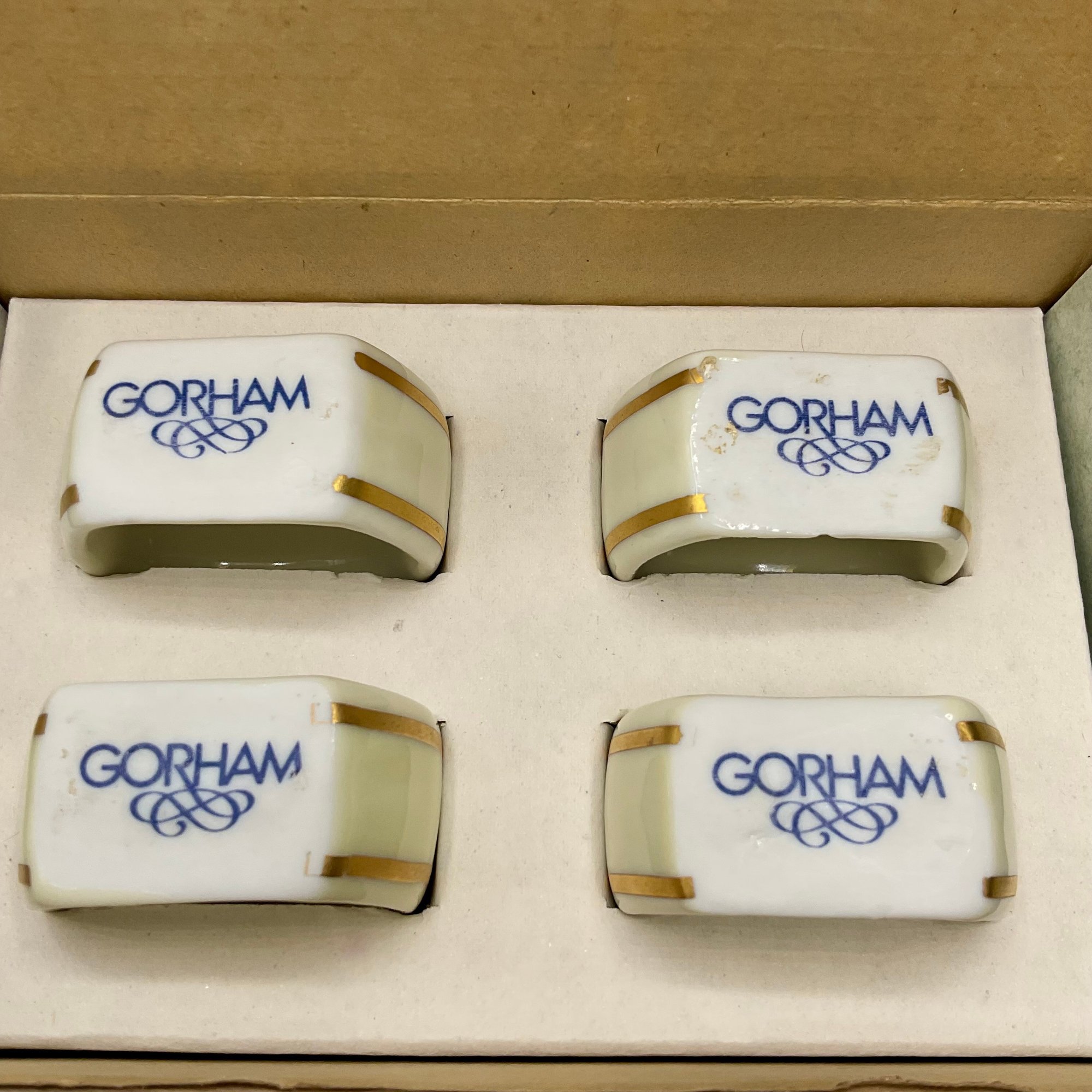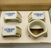 This is a beautiful set of four Gorham Fine China napkin rings, presented in their original 4-inch branded display box. Each piece features a classic ivory porcelain finish accented with elegant double gold bands and the distinctive blue Gorham scroll logo.