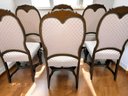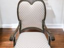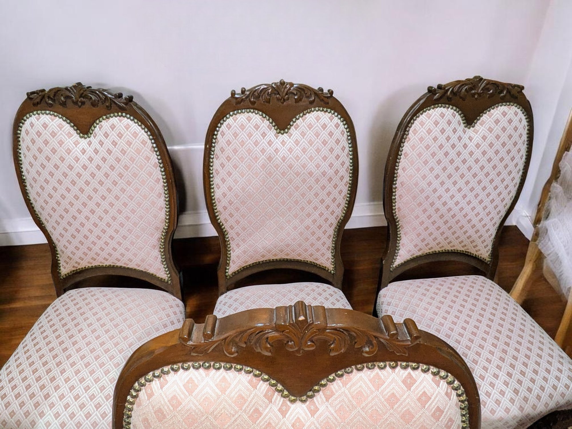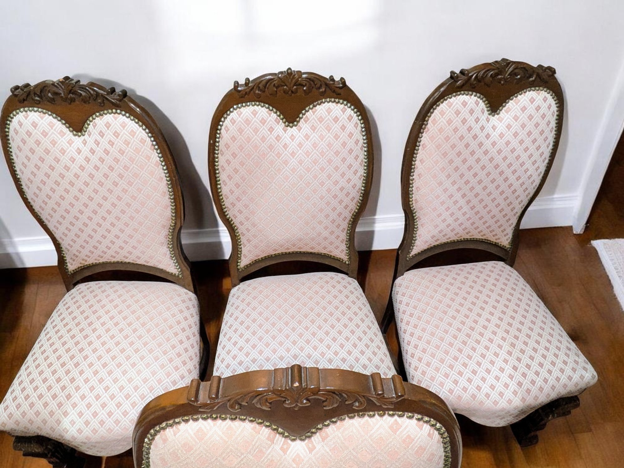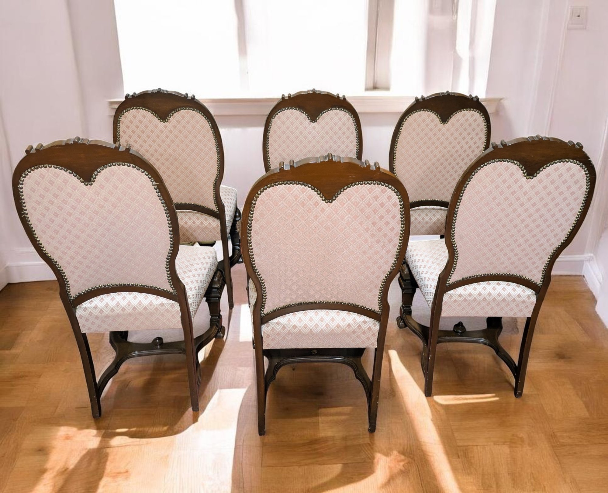 Set of 6 Antique/Vintage Victorian-Style Dining Chairs with Custom Upholstery (One Armchair Only). Solid Mahogany Wood Chairs with Intricate Carved Details, Nailhead Accents, Upholstered in a Pink and Cream Geometric Pattern Fabric. The Fabric is in Excellent/Very Good Condition. Marks on the wood and legs consistent with age and use can be filled in with stain renew. Overall, Very Good Antique/Vintage Condition. Please see all photos as part of the description and condition. 24"W x 45"H x 24"D