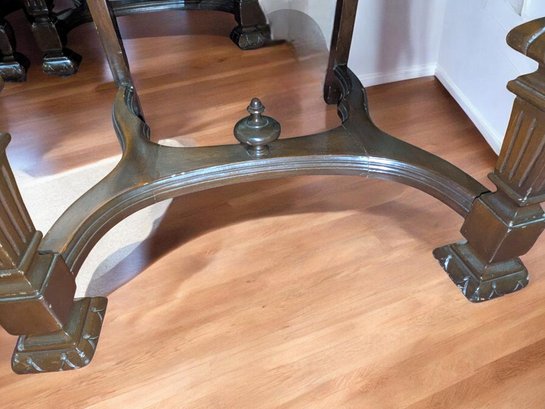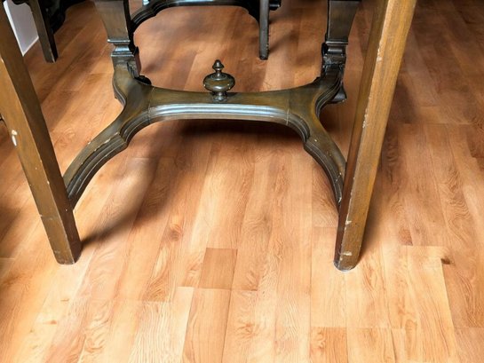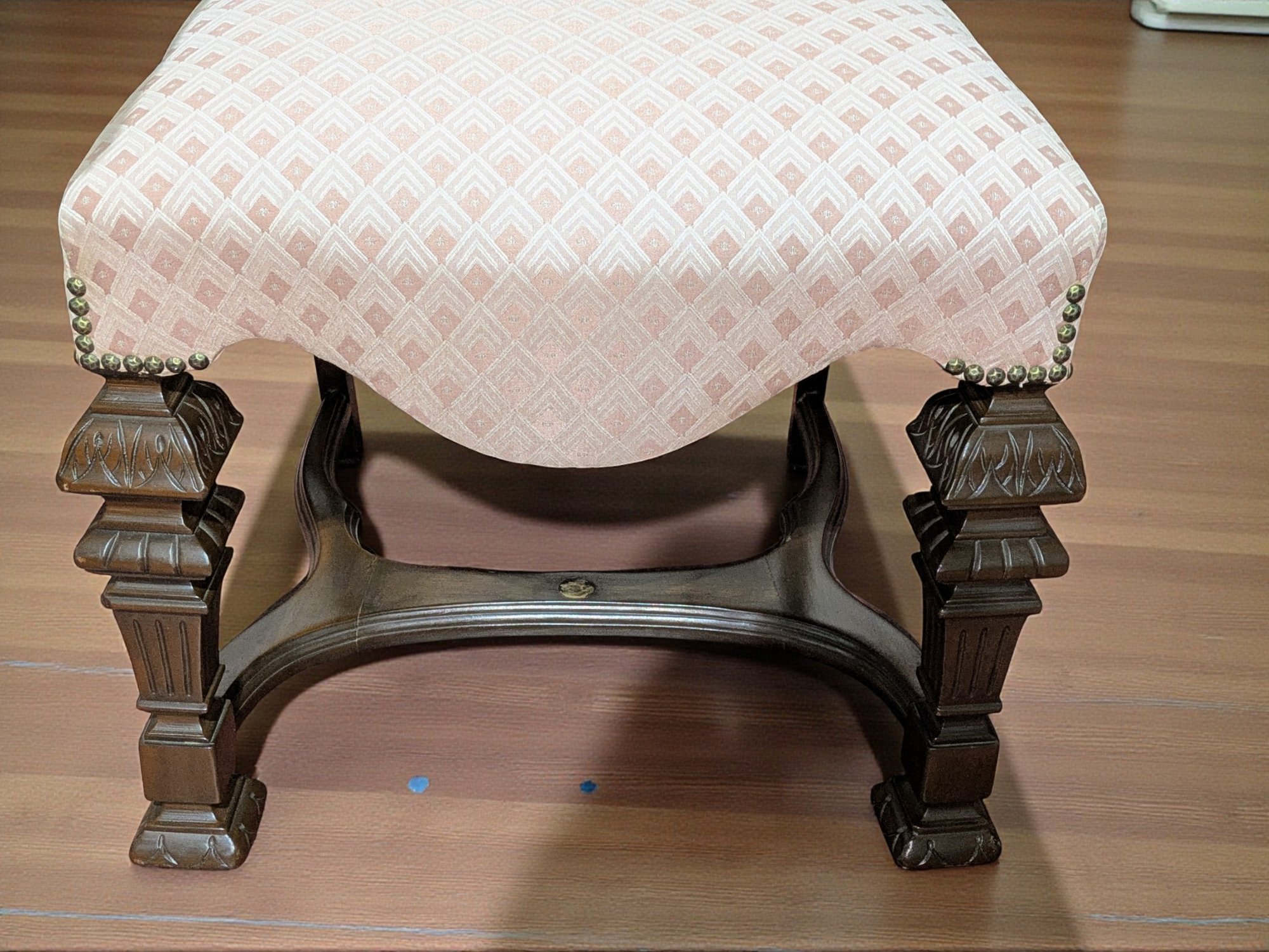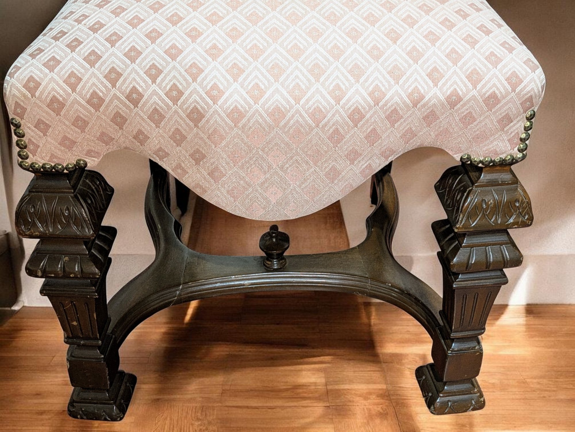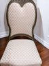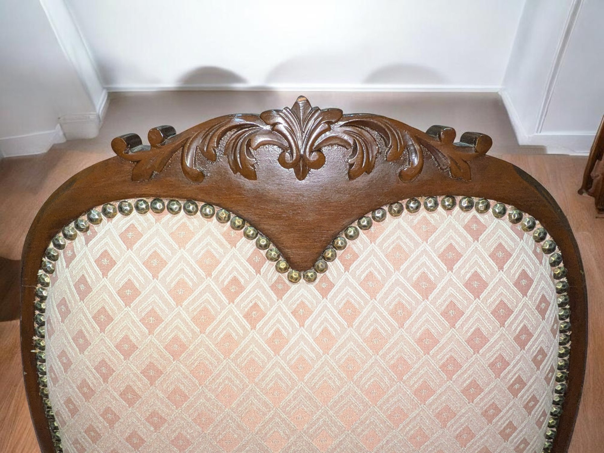 Set of 6 Antique/Vintage Victorian-Style Dining Chairs with Custom Upholstery (One Armchair Only). Solid Mahogany Wood Chairs with Intricate Carved Details, Nailhead Accents, Upholstered in a Pink and Cream Geometric Pattern Fabric. The Fabric is in Excellent/Very Good Condition. Marks on the wood and legs consistent with age and use can be filled in with stain renew. Overall, Very Good Antique/Vintage Condition. Please see all photos as part of the description and condition. 24"W x 45"H x 24"D