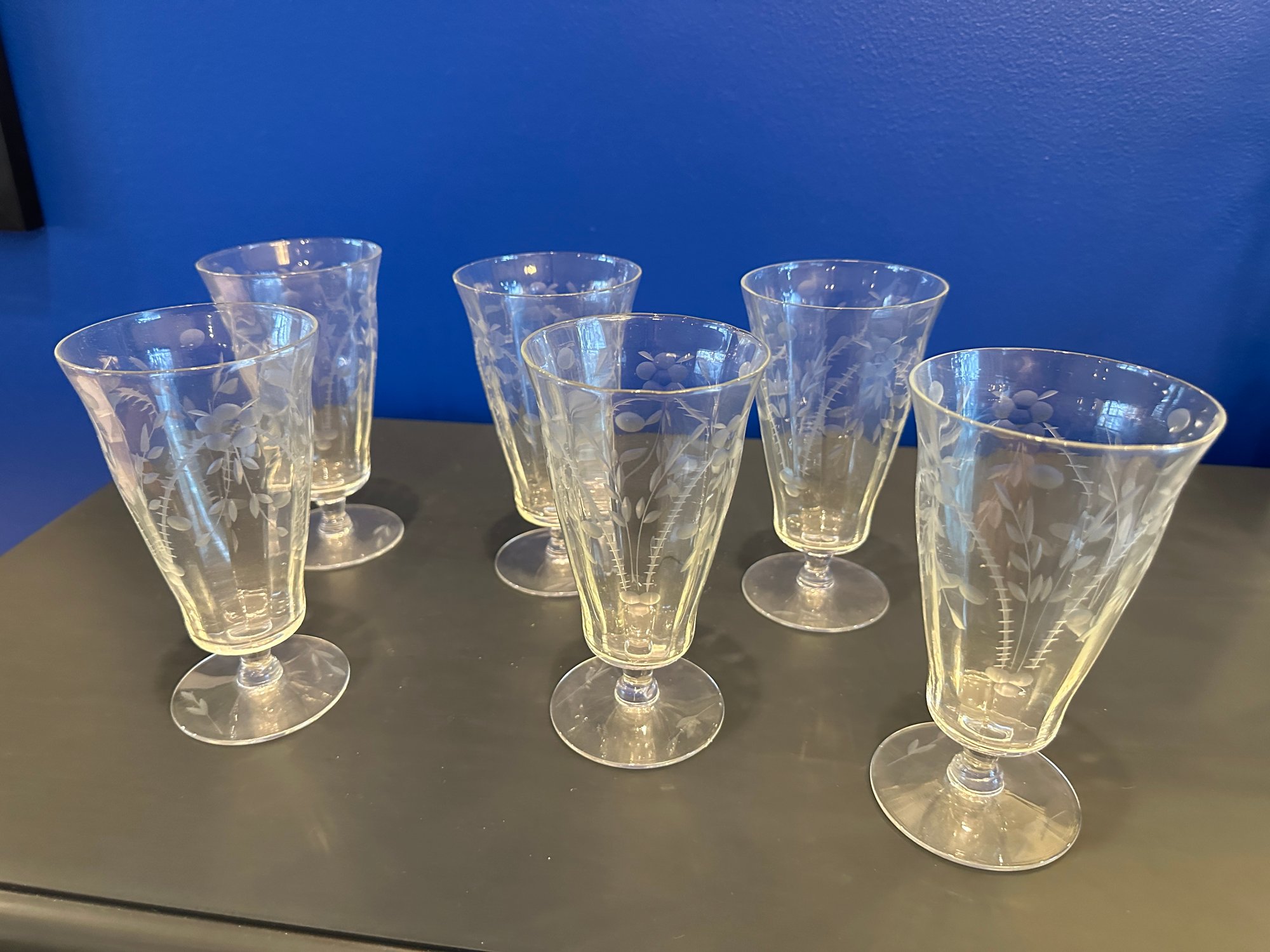one glass has tiny chip on lip. footed.