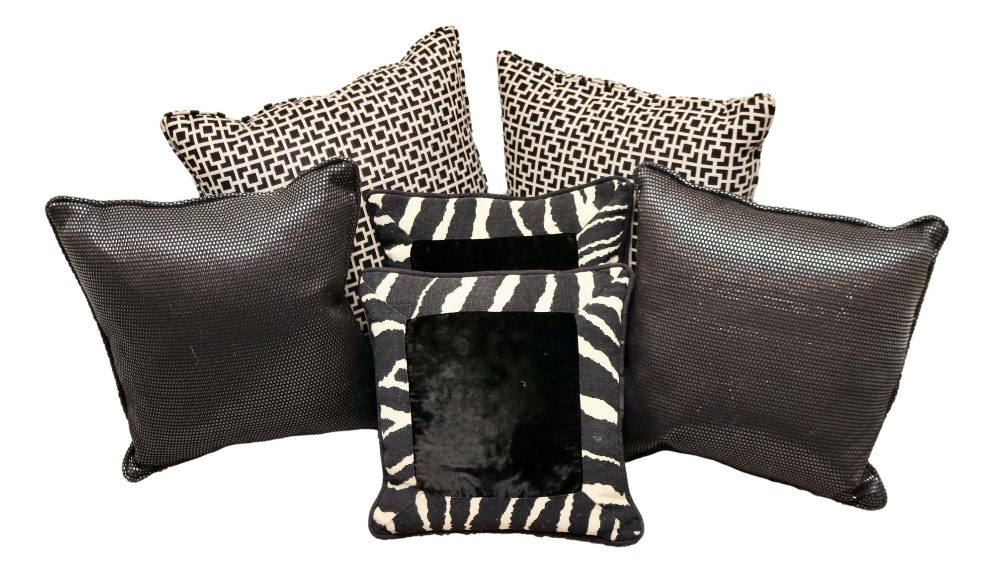 A striking set of six accent pillows in a bold black and white palette. Featuring a mix of geometric patterns, sleek textured black, and zebra-inspired designs with plush velvet centers, these pillows bring depth and drama to any sofa, bed, or chair. A perfect blend of modern elegance and timeless appeal, this set is a must-have for maximalist, contemporary, or eclectic interiors.