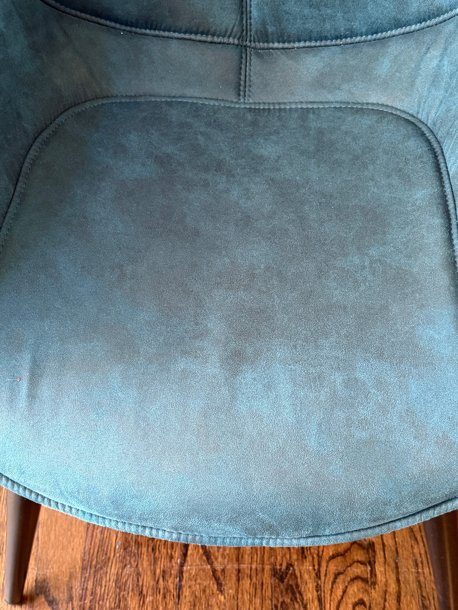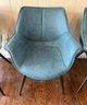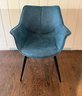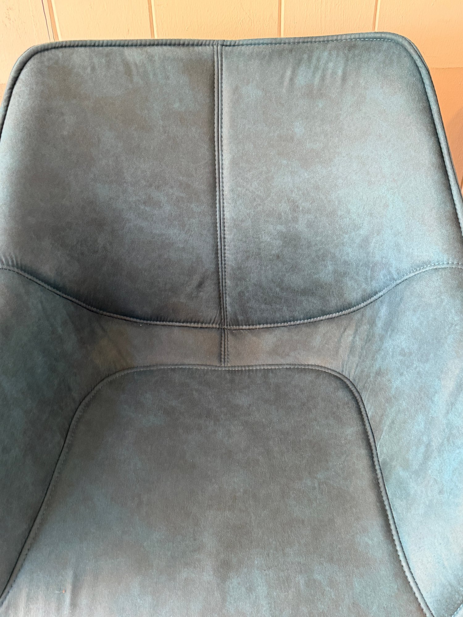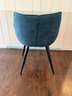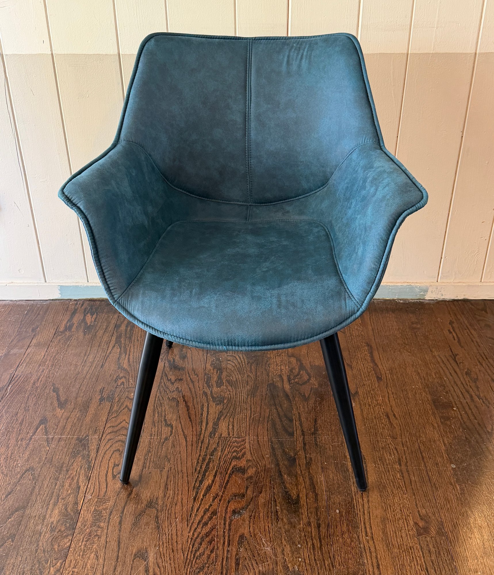 Upholstered in blue/green suede like polyester fabric with black metal legs.