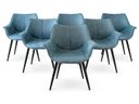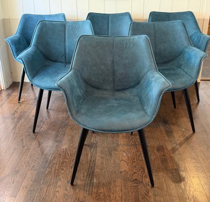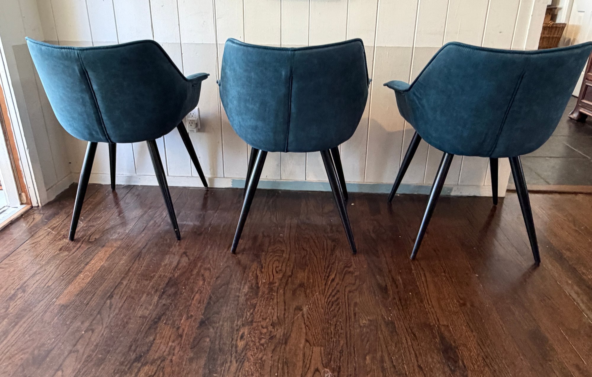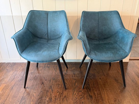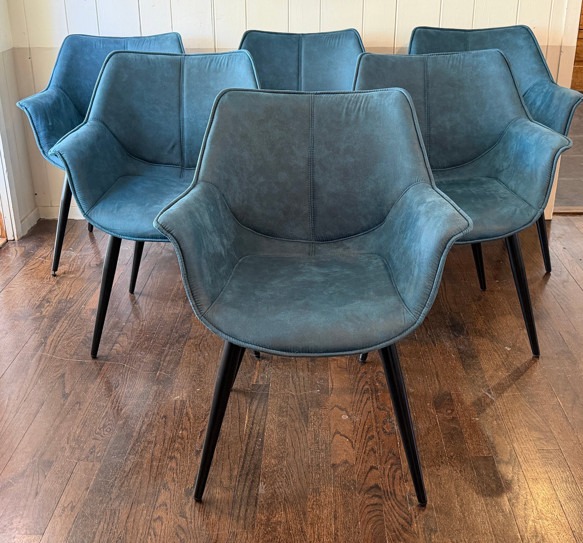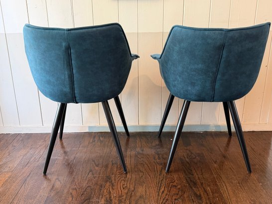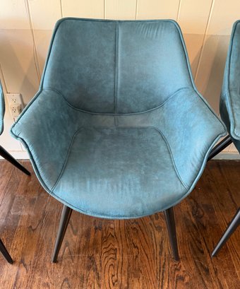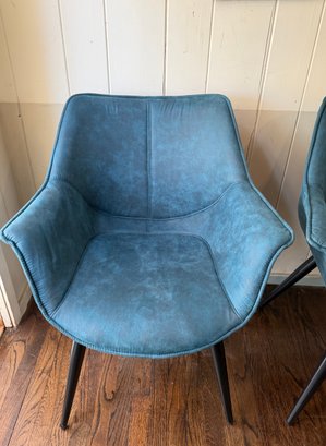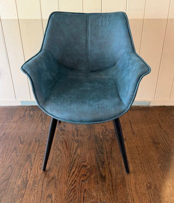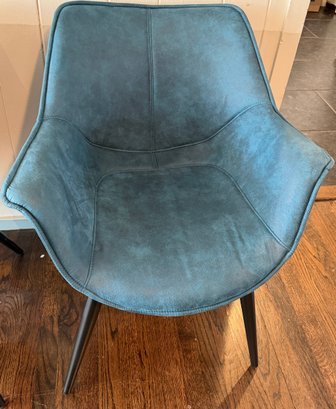 Upholstered in blue/green suede like polyester fabric with black metal legs.
