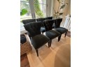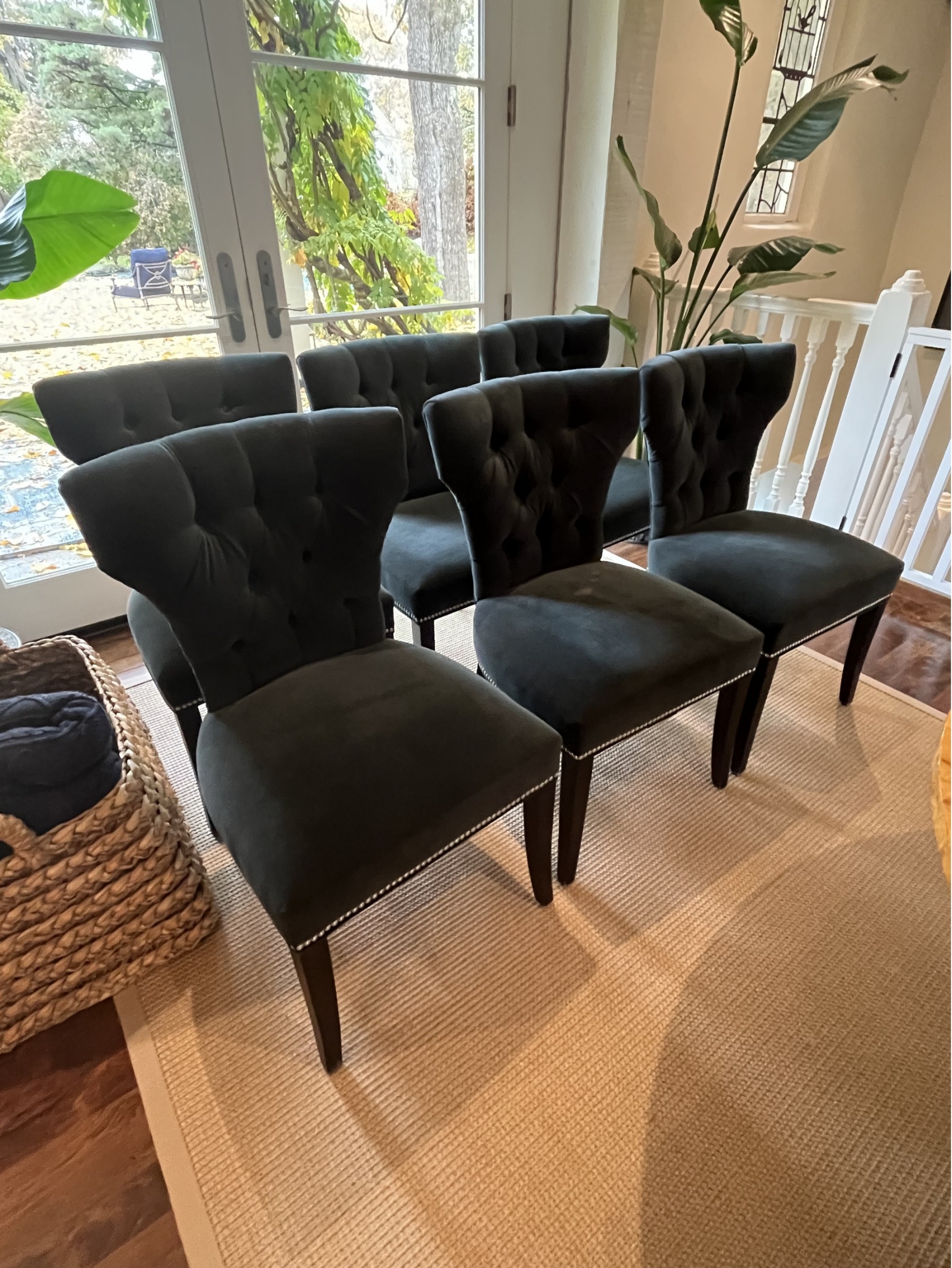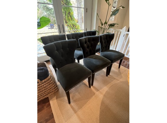 Set of 6 upholstered dining chairs with tufted backs. Nail head trim. A dark teal color. Fabric seems to have a mohair or velvet feel to it. Some mild staining
