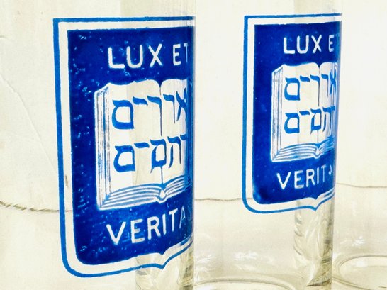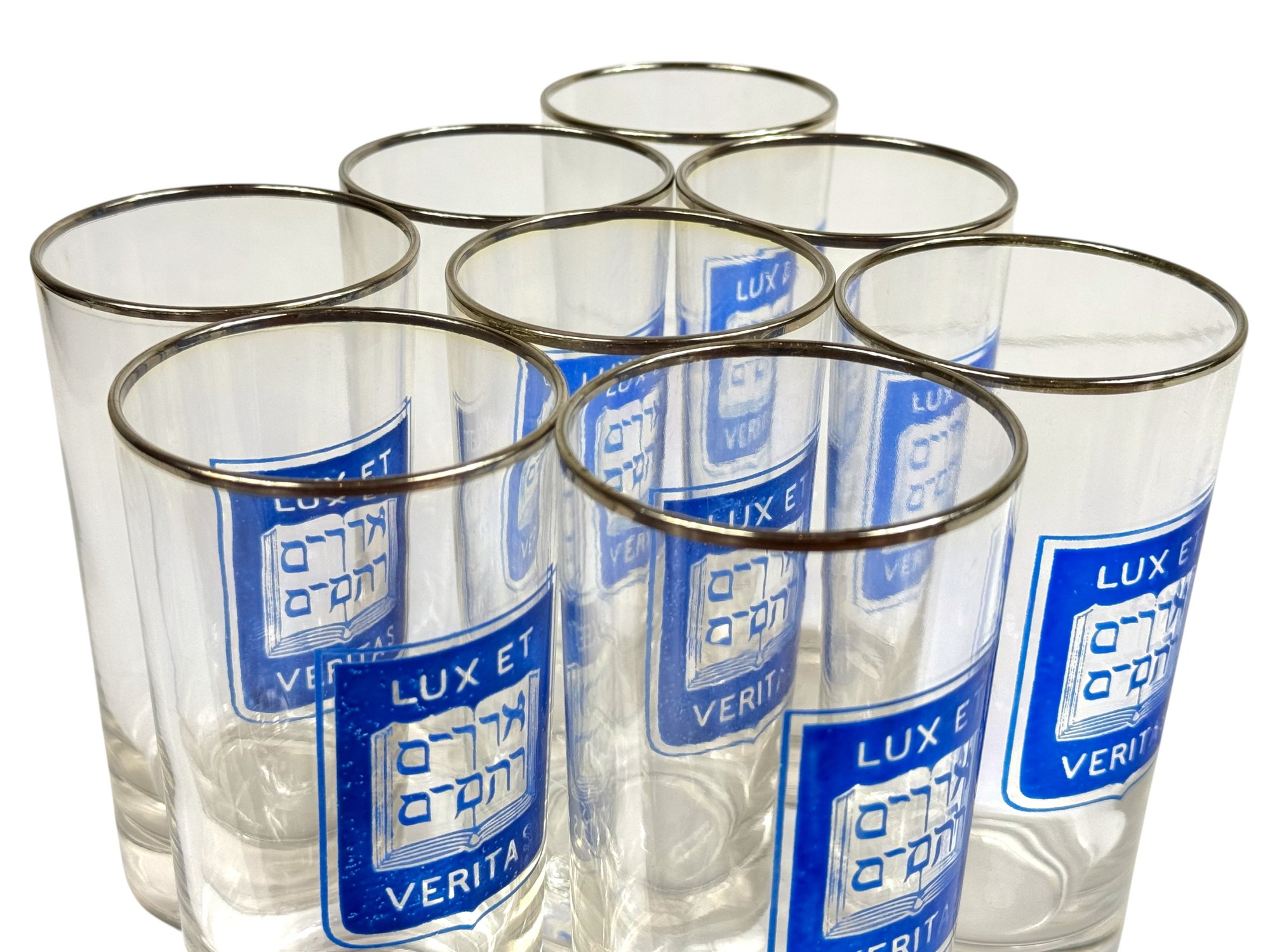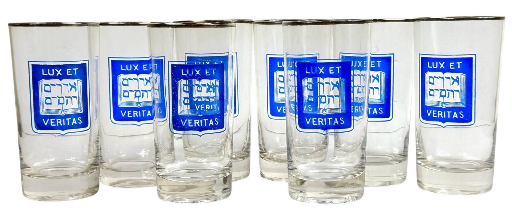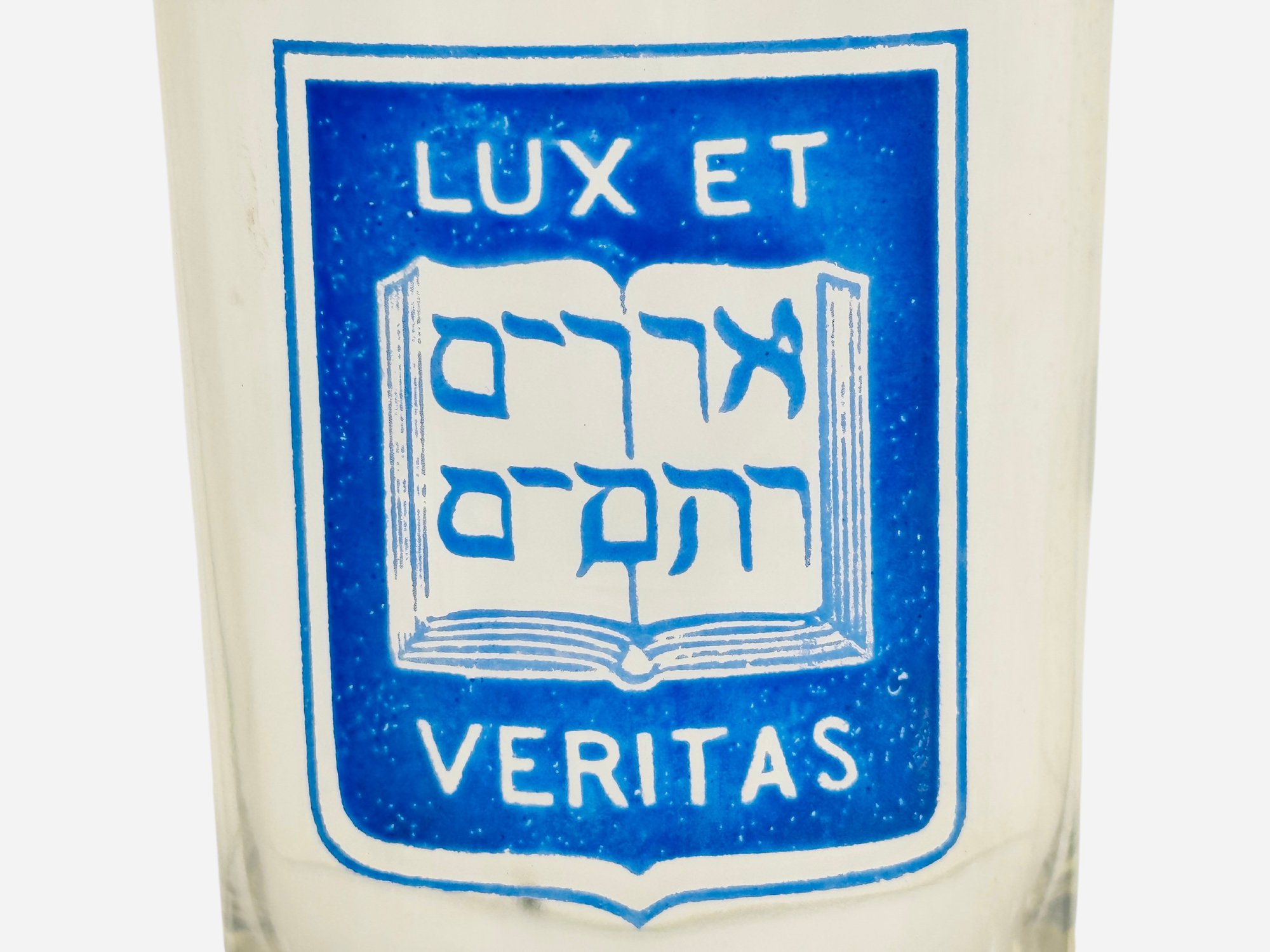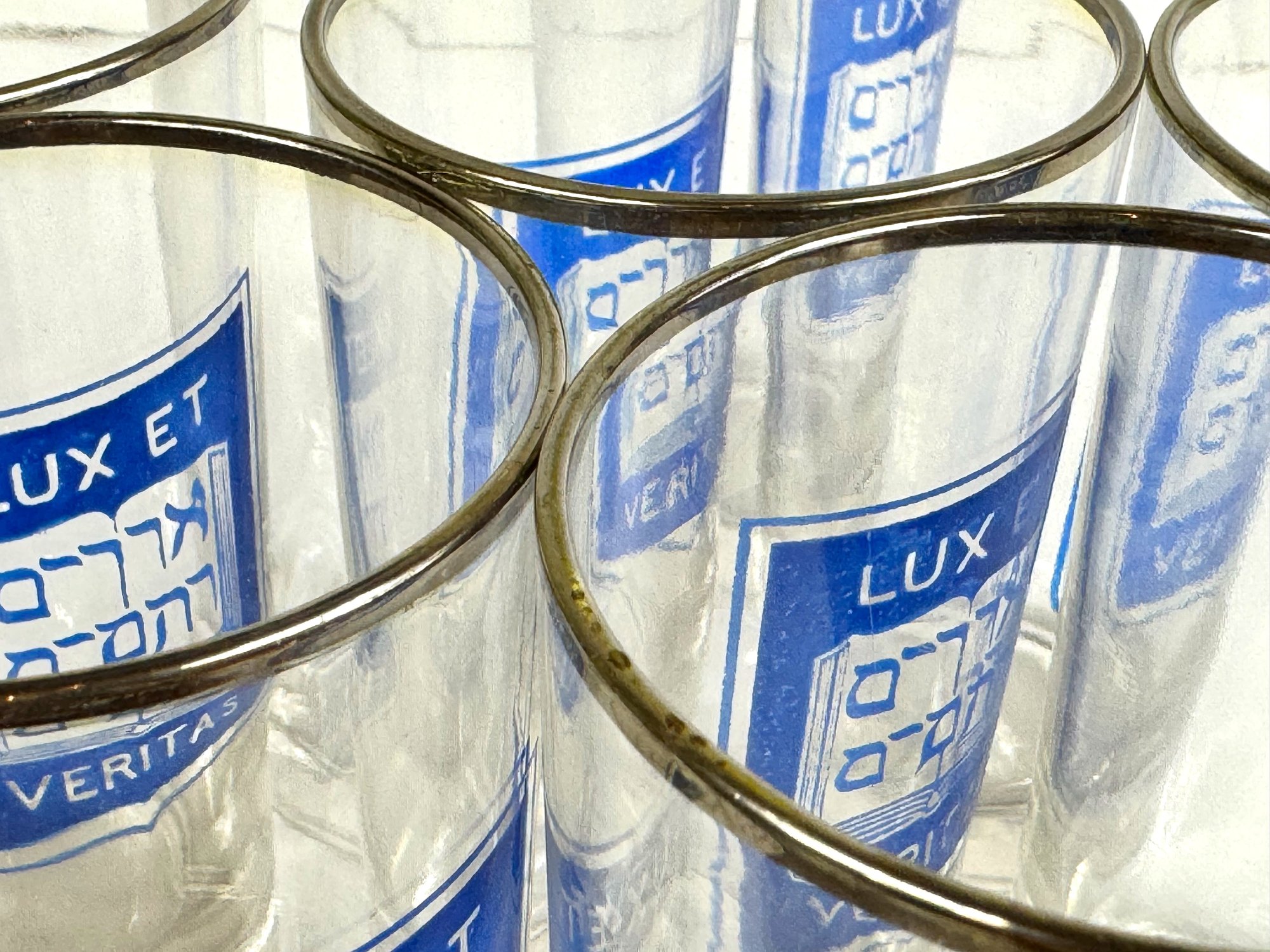 This vintage matching set of Yale University glasses boast the Latin motto Lux Et Veritas and and have silver rims.. They stand 5 5/8" and have a top opening of 2 3/4" wide.
