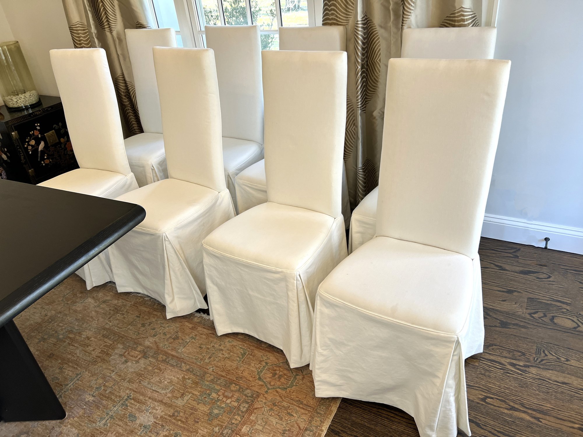 Set of eight sophisticated and classically timeless white slipcovered upright dining chairs.