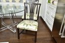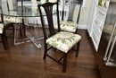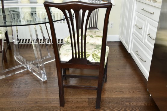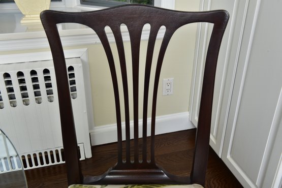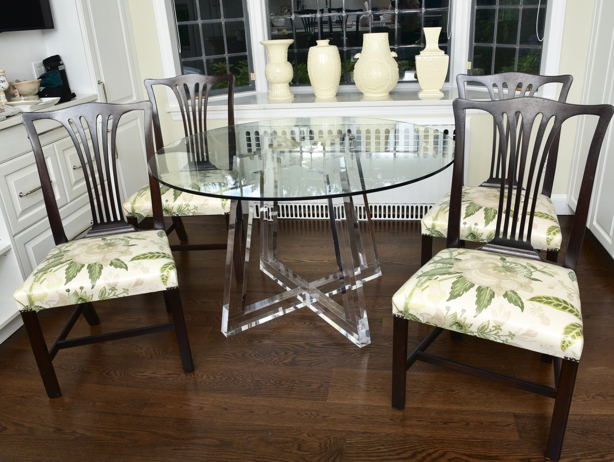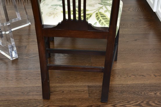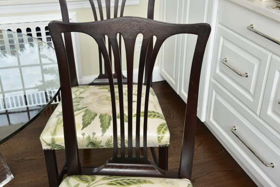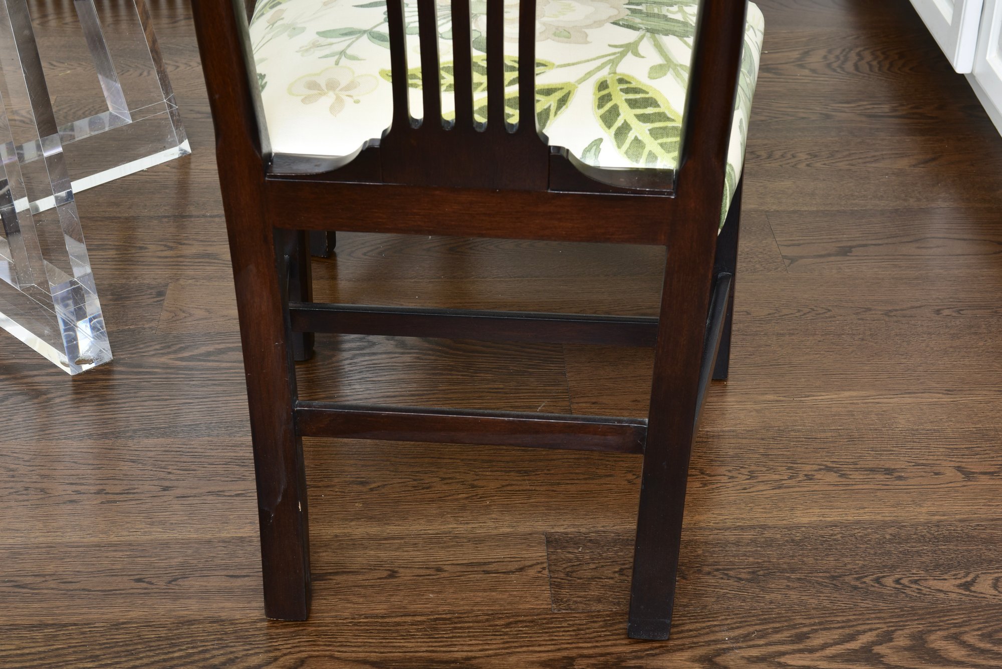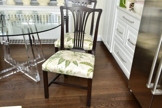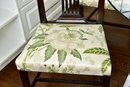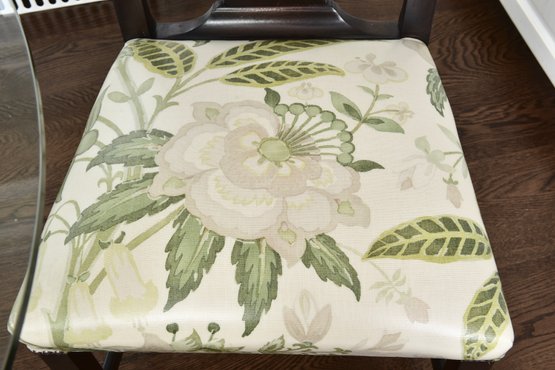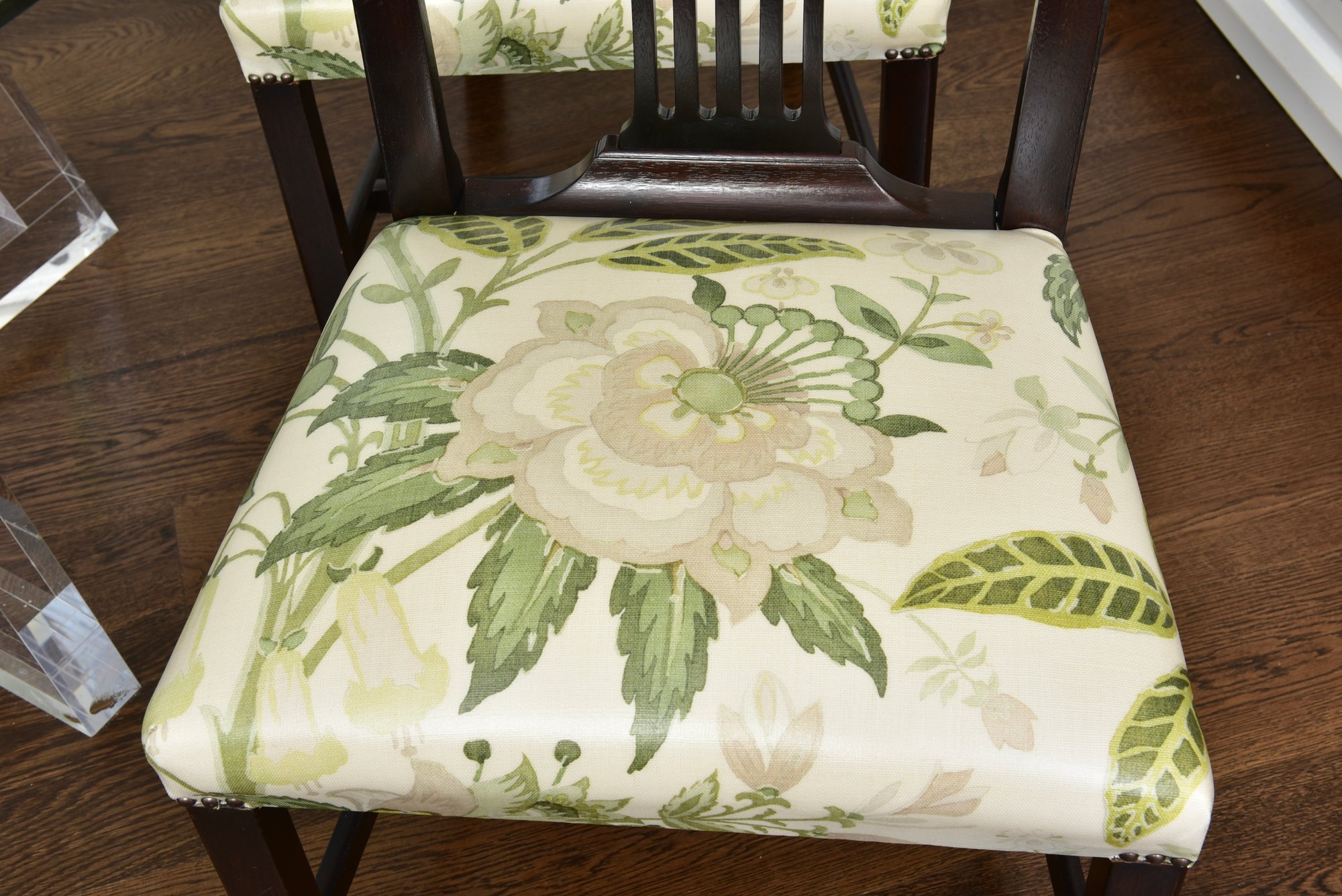 Custom upholstered in a vinyl floral fabric for easy cleanup.