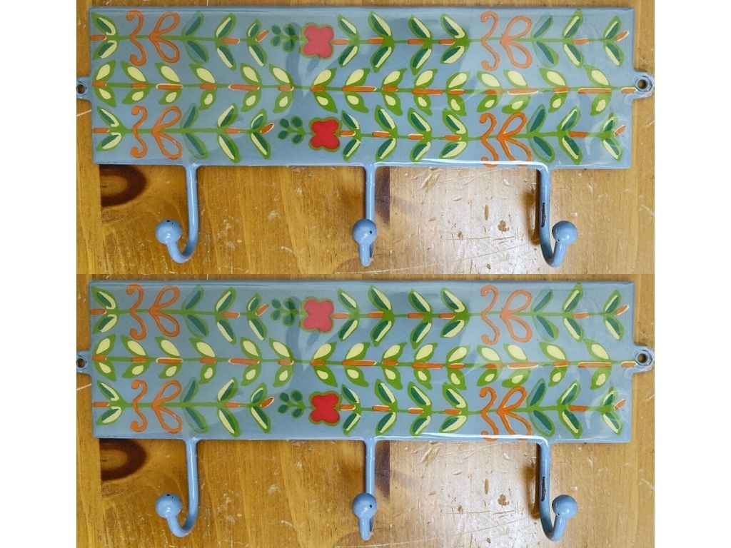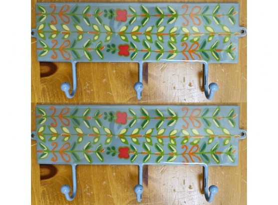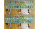Set of metal hooks painted and glazed in light blue, yellow, red and green pattern. Each is 9" long and contains 3 hanging hooks. Perfect for a mud room or entryway.