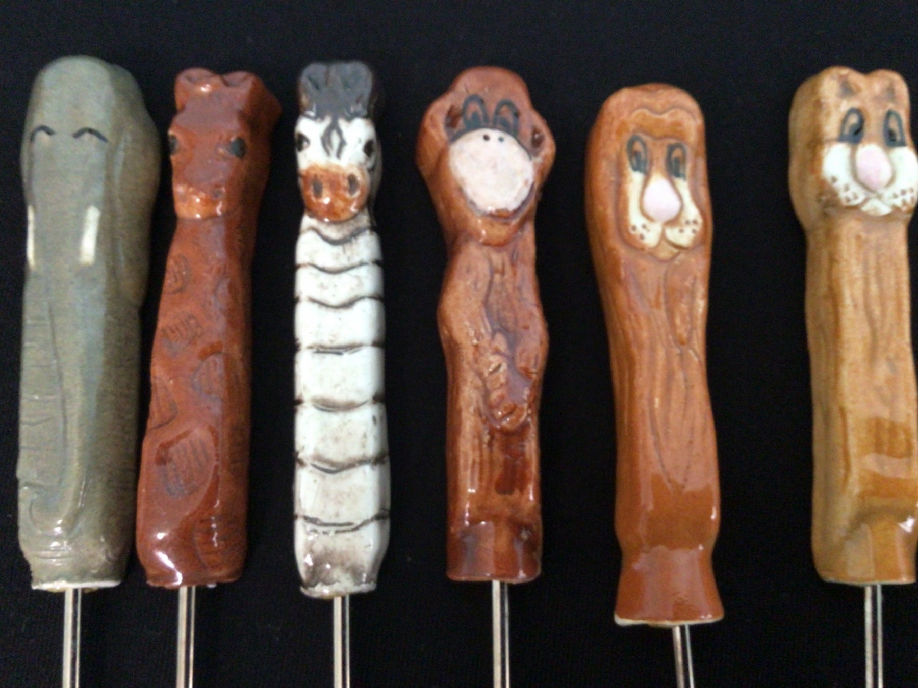 Features six different ceramic animals as the handles on the metal forks