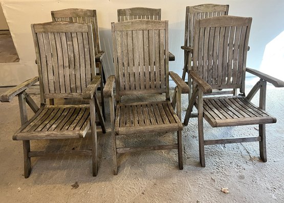 Nice set of six solid teak patio dining chair with adjustable seatback angles and folding capability for easy winter storage.