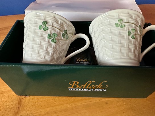 set of two Belleek Shamrock Basketweave mugs in their original box. Belleek is a type of fine Parian china from Ireland, known for its delicate designs. The Shamrock Basketweave pattern, featuring a woven texture and hand-painted shamrocks, was first introduced in the 1880s and remains iconic.