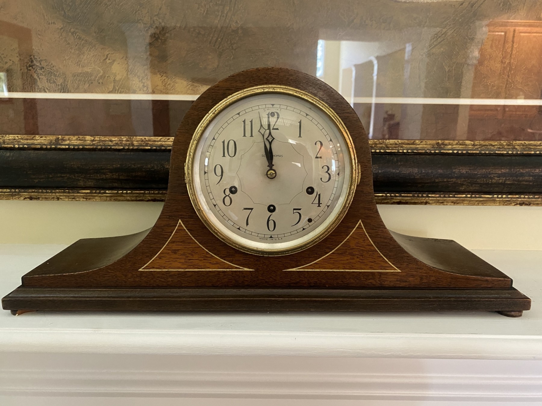 Beautiful multi types of wood. #117 W. Chime Thomaston, Conn. W/ key beautiful clock. has labels and instructions taped to inside.