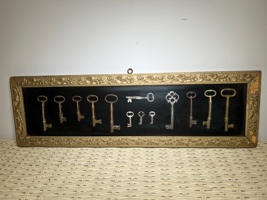 Collection of antique skeleton keys displayed in an antique plaster framed shadow box.