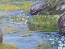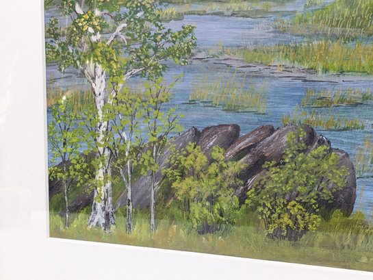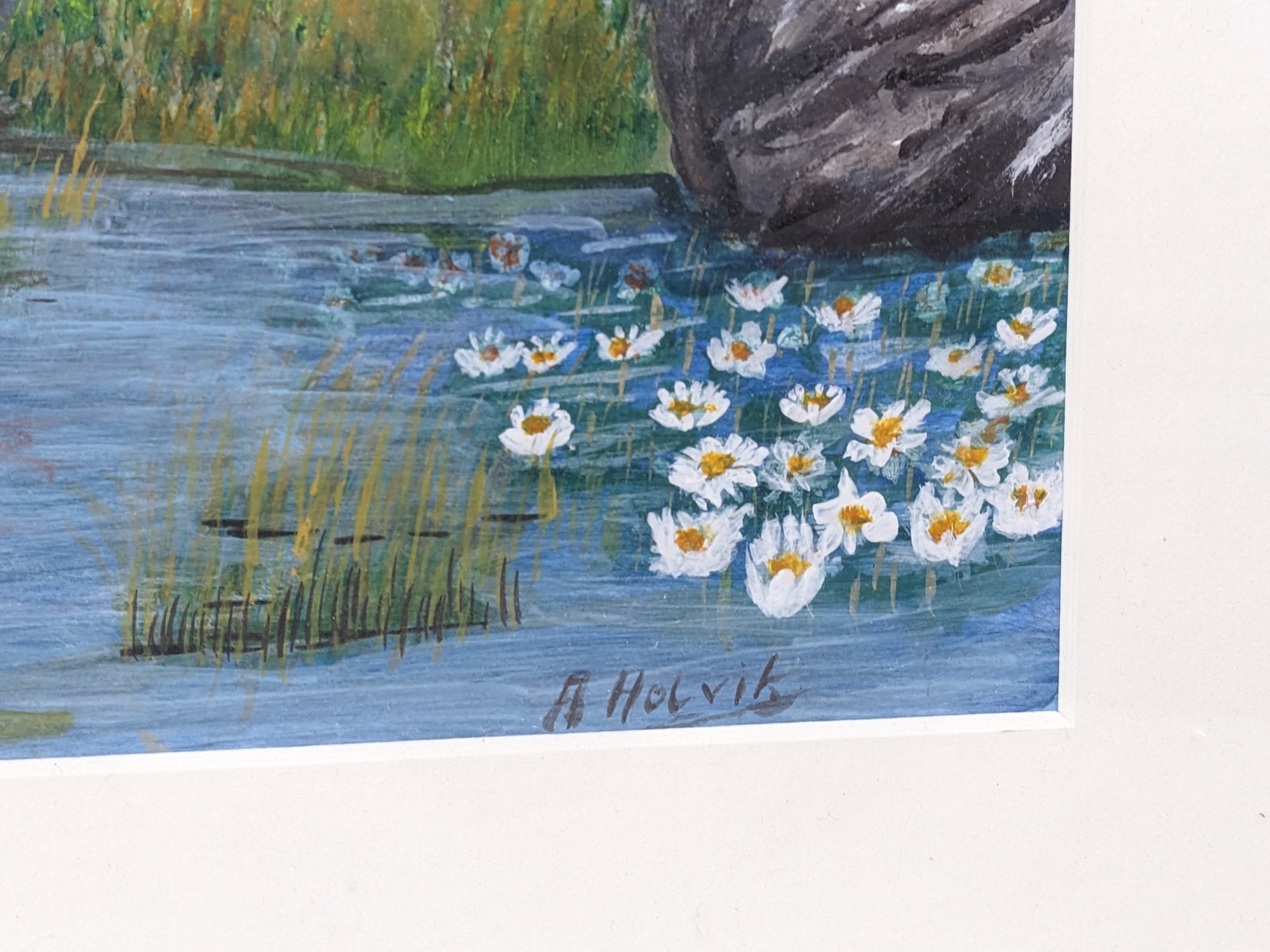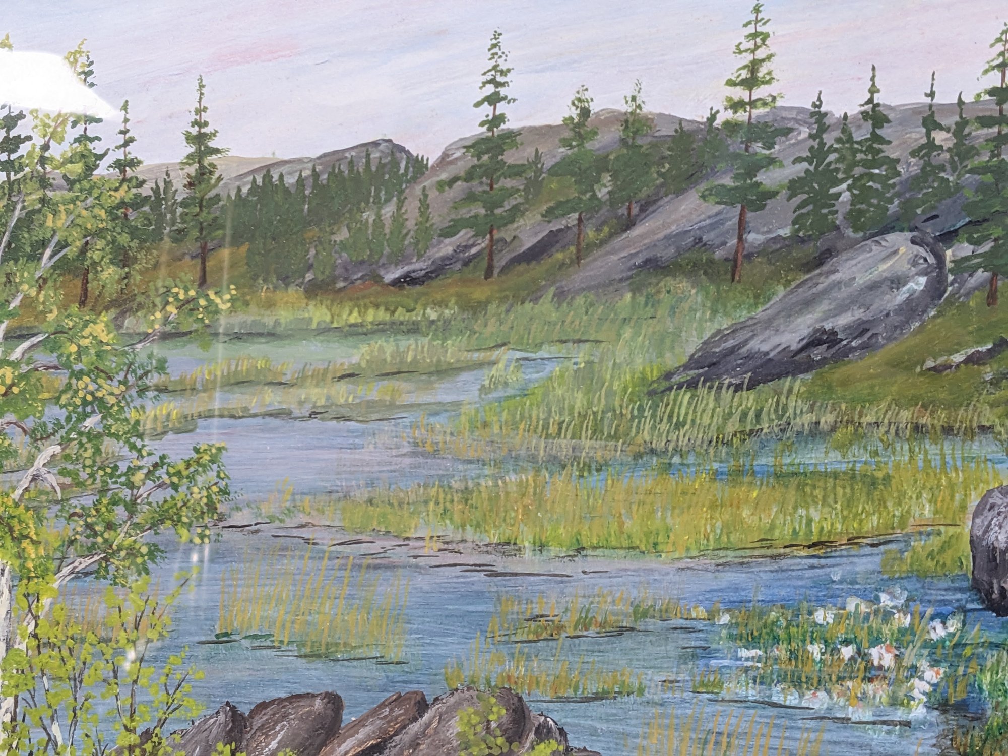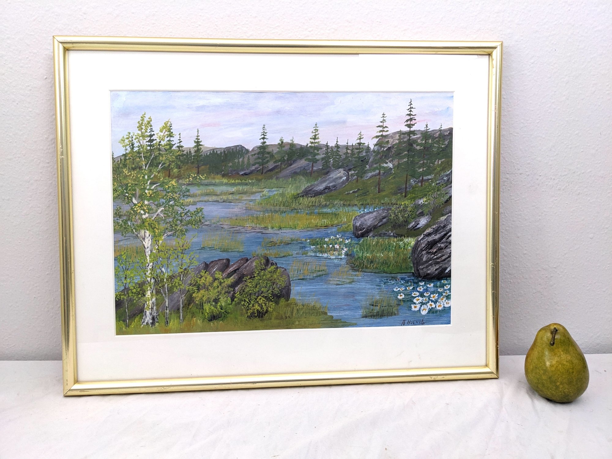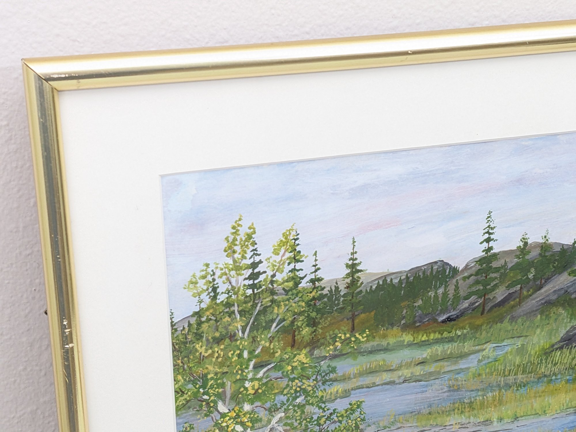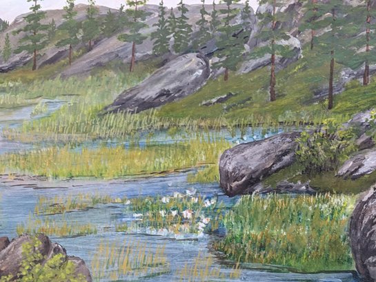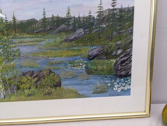 This painting is very nicely done. It looks to be a watercolor or possible gouache. The frame has some light wear from age and use.