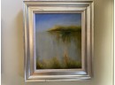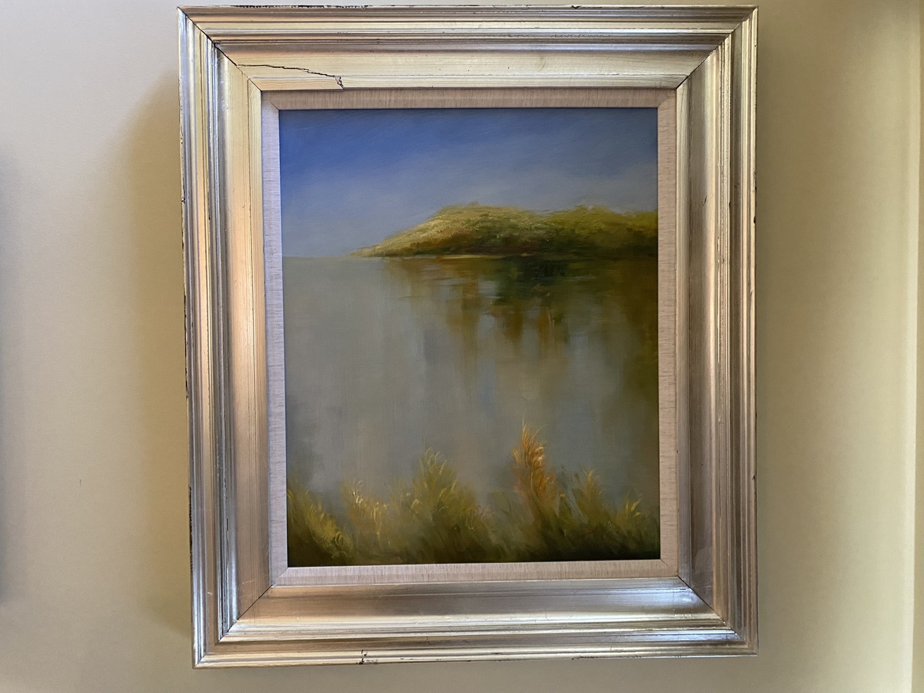 signature unreadable. silver framed landscape. 28 1/2 x 32 1/2.