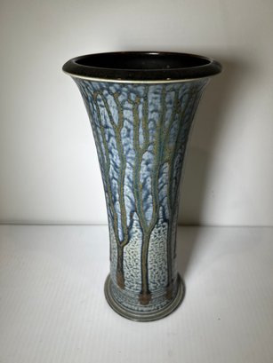 Hand-thrown studio pottery vase with an ash glaze in a design of leafless trees, signed and dated 2001.