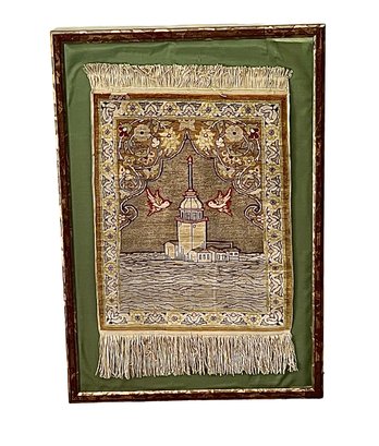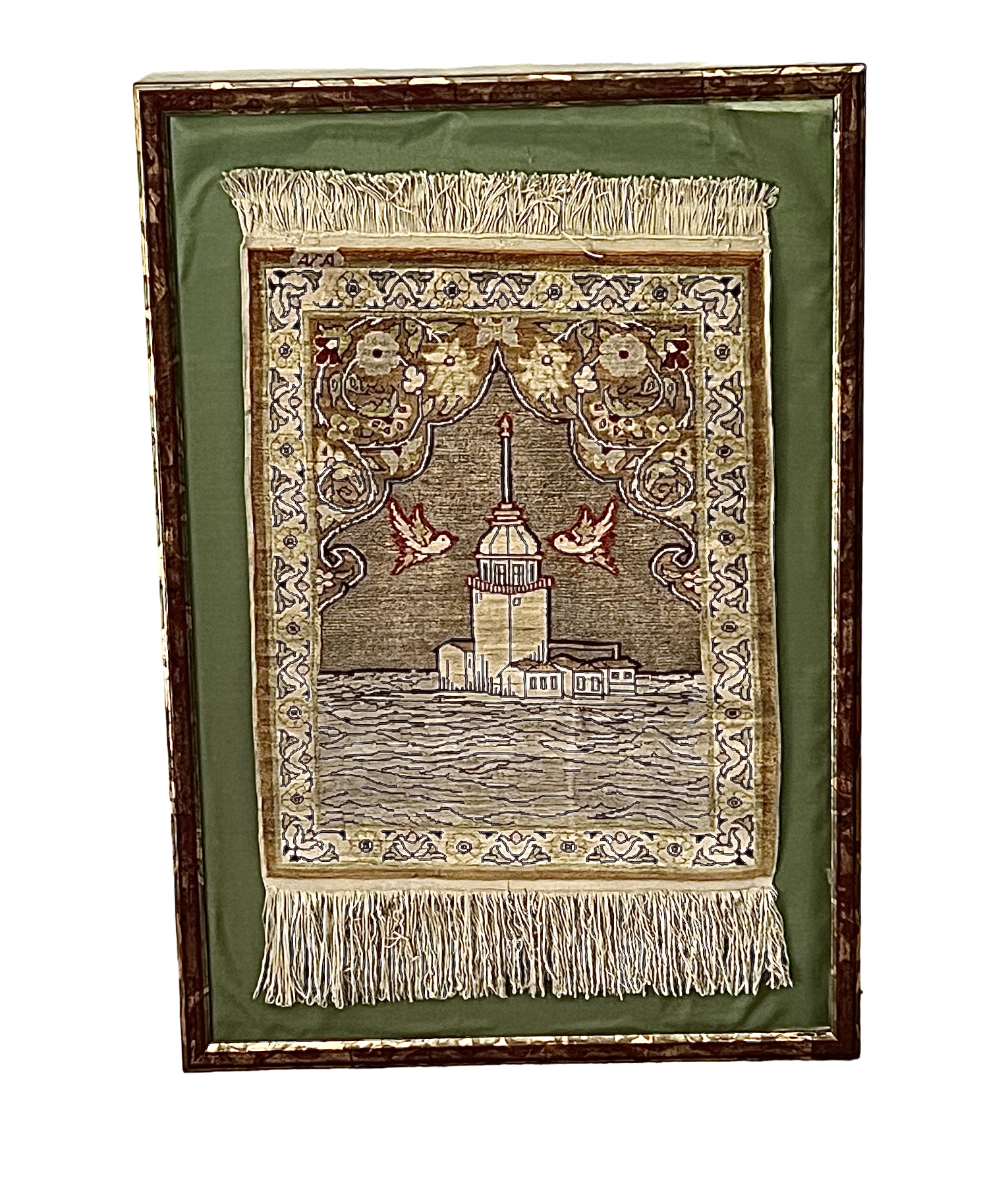 Condition: Water damage to back of frame. Some fabric is lifting on top right corner. Dimensions: 25 1/2" H x 17 1/2" W, overall