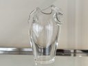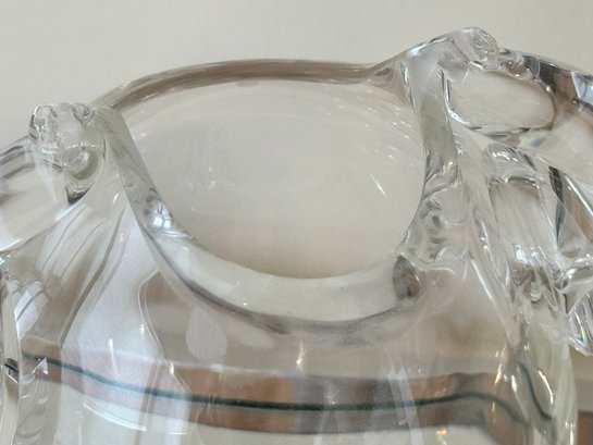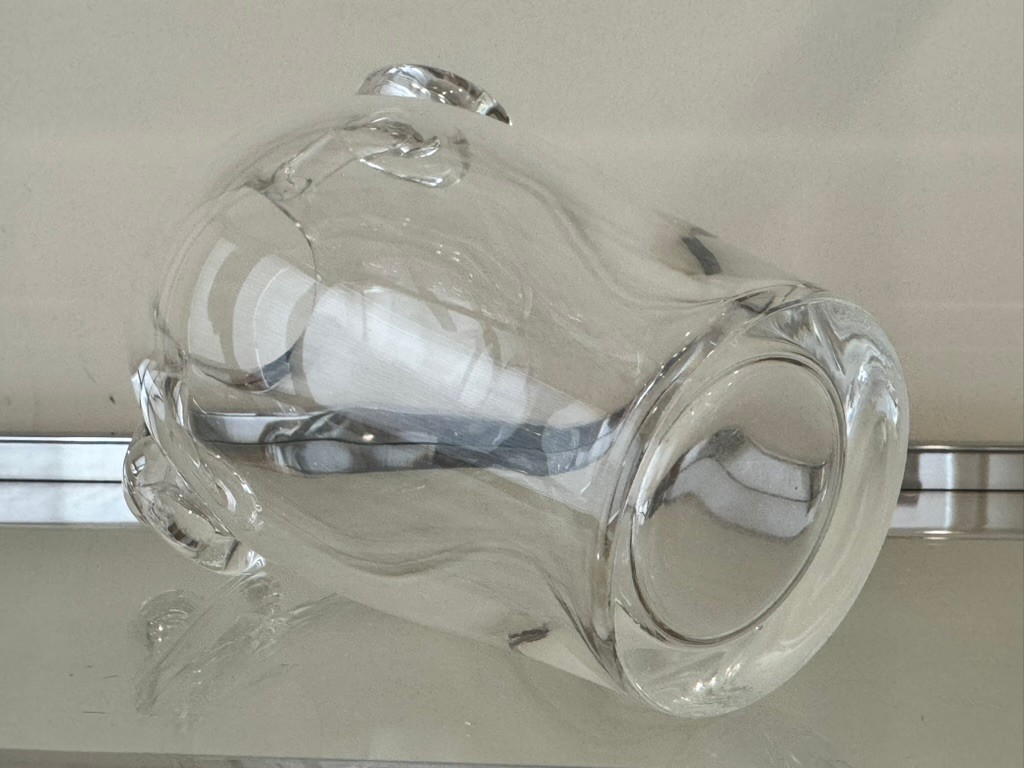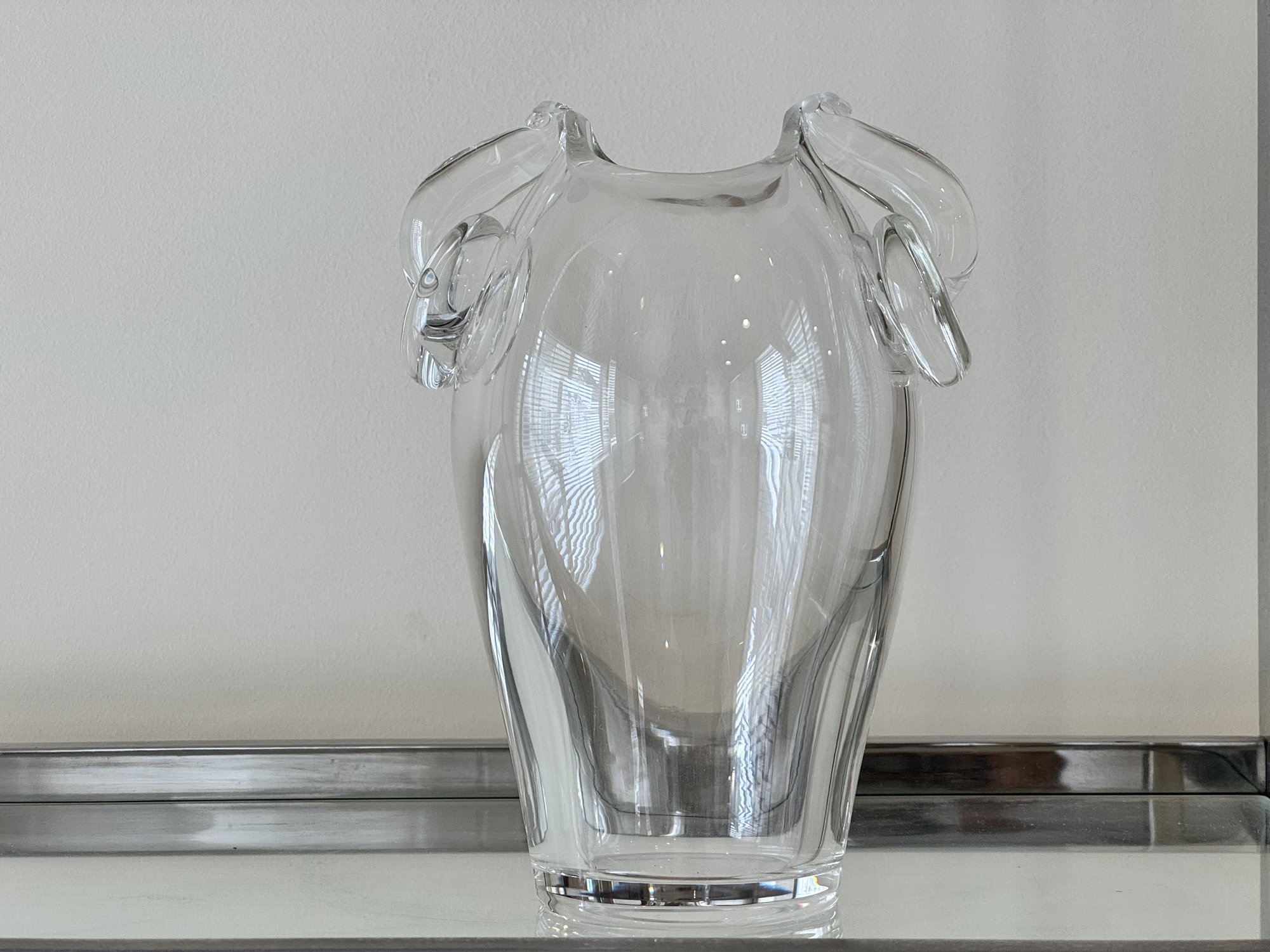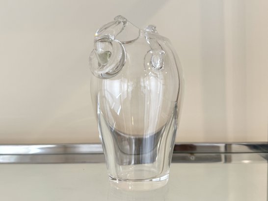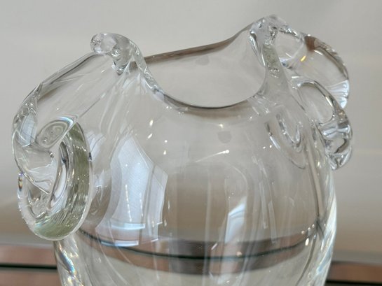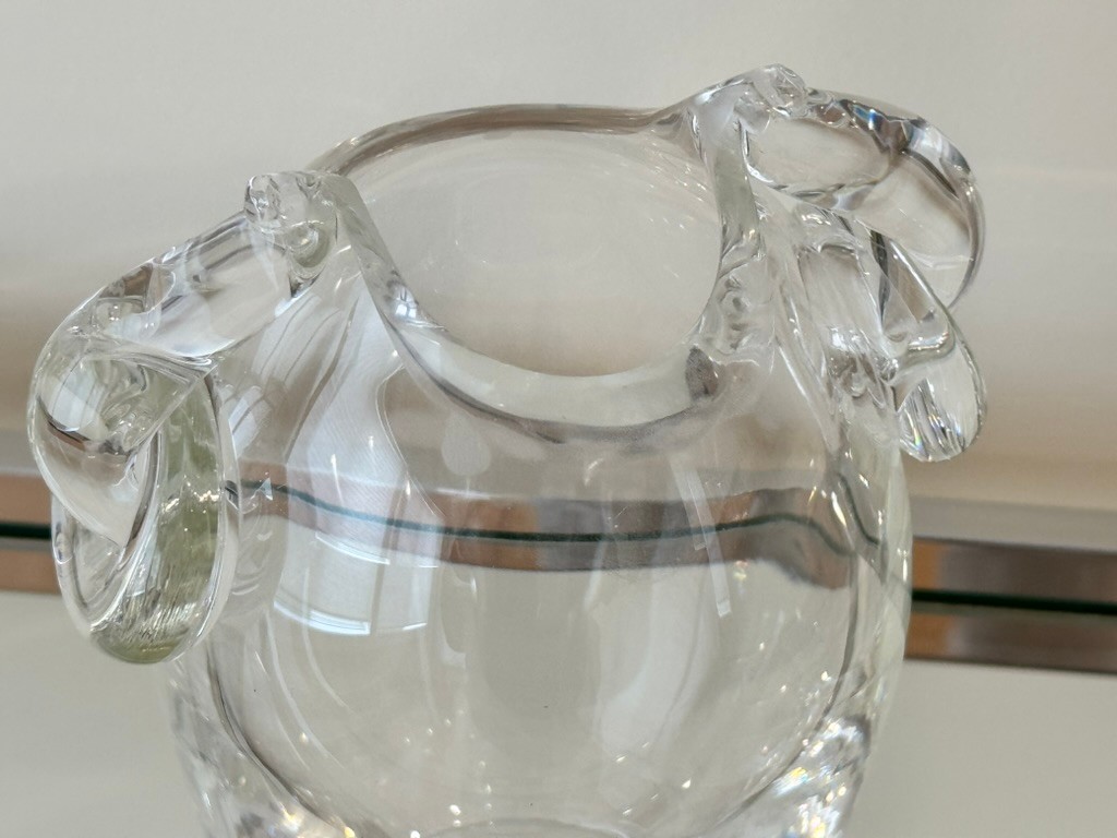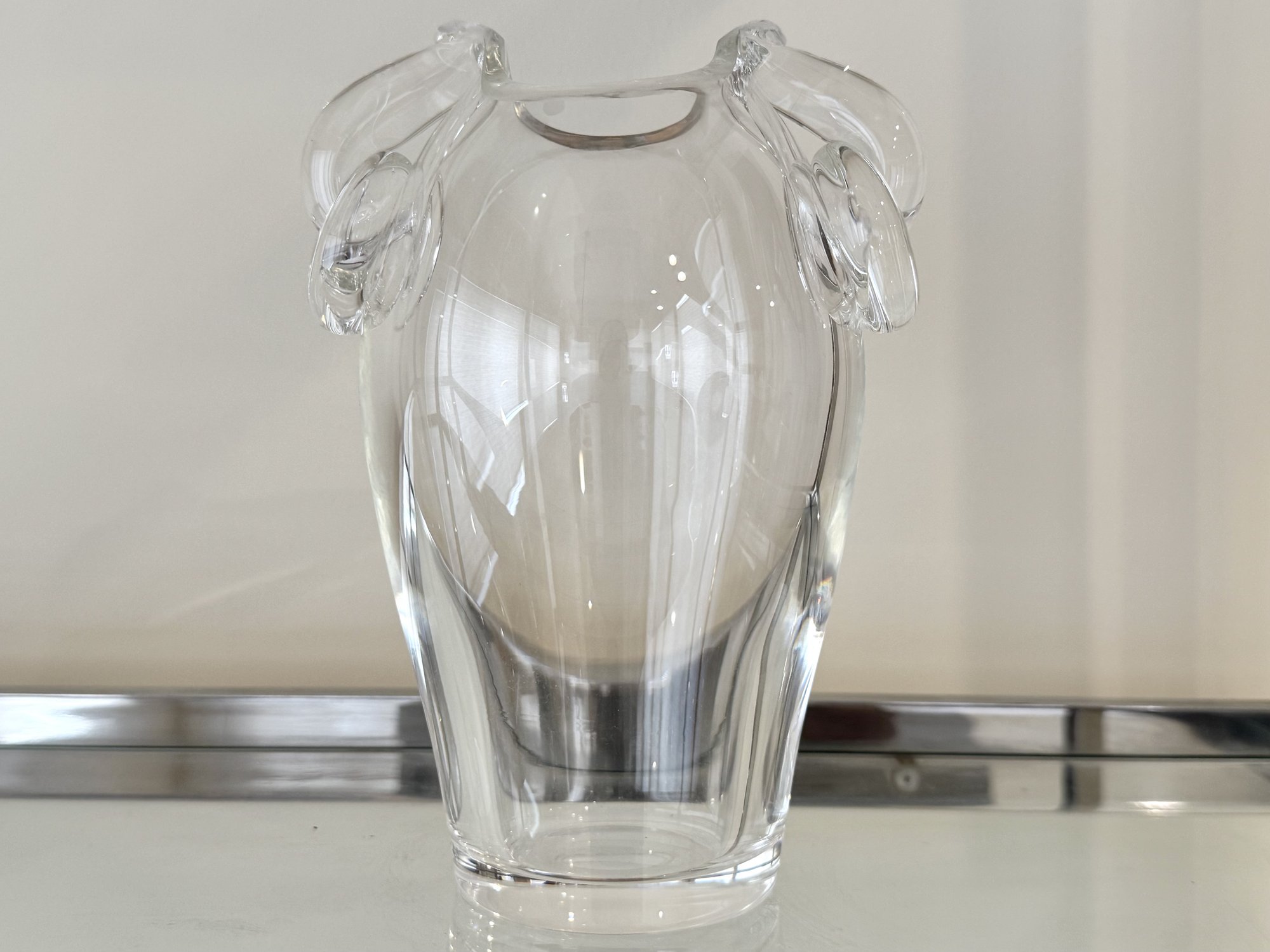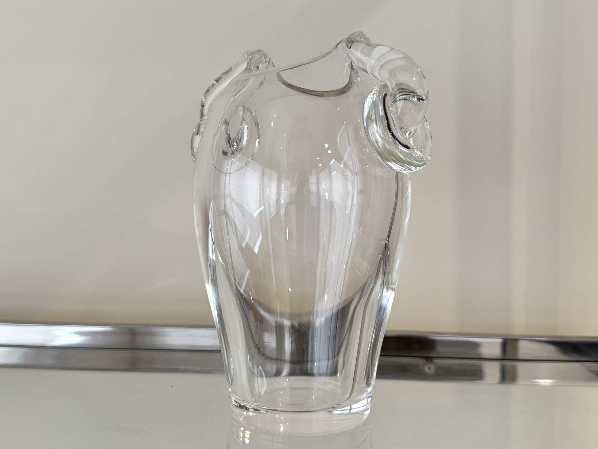 Elegant and substantial clear art glass vase attributed to Steuben, featuring a softly tapered cylindrical form with applied loop handles at the rim. The thick, heavy crystal body displays exceptional clarity with beautiful light refraction throughout.