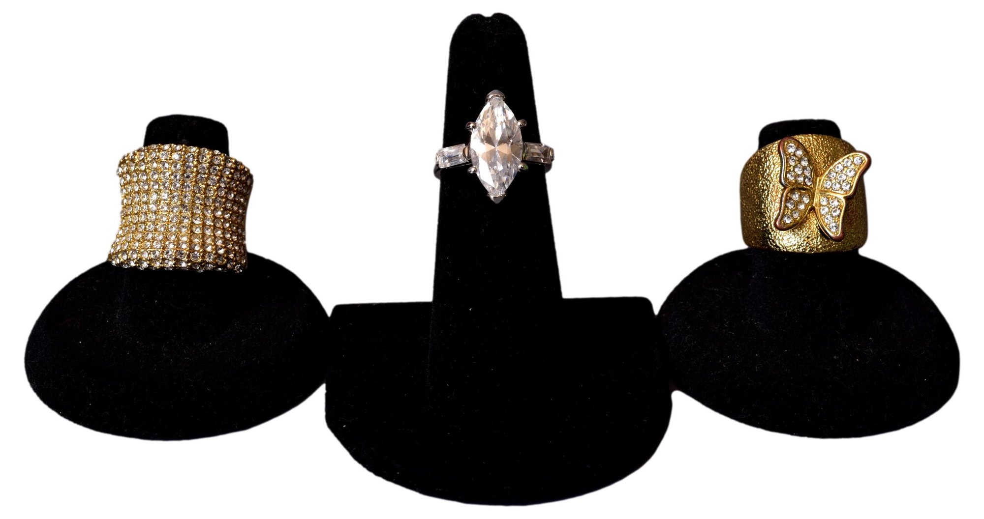 Condition: The rhinestone and butterfly ring has some wear on the band portion; the Uncas ring is in very good condition. Please view all photos as they are deemed part of the description.