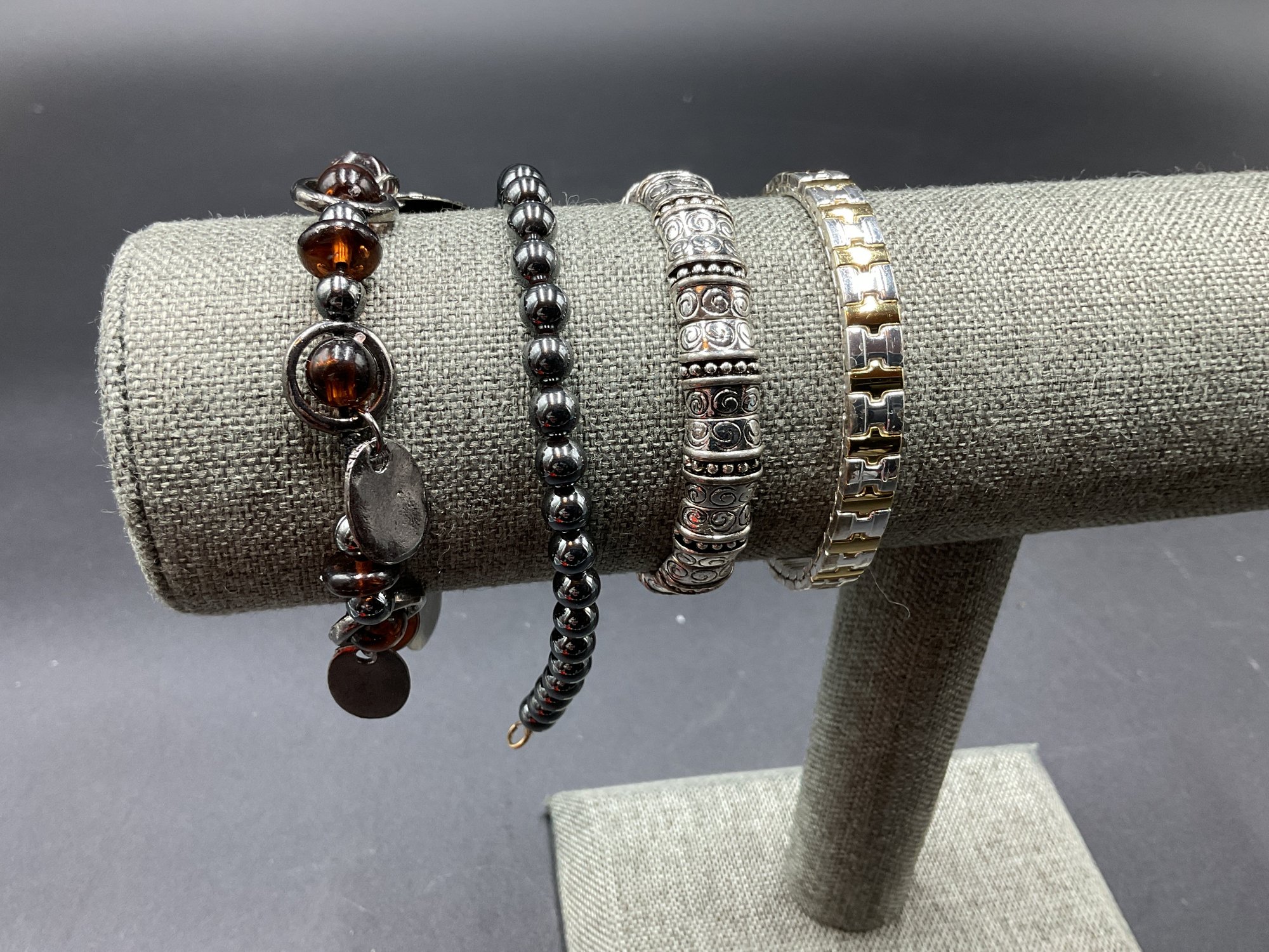 Four pretty bracelets in this lot. Hematite bracelet has marked 14K clasp (7"L), others unmarked with stretch elastic. All in excellent condition.