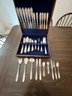 will ship WITHOUT the box for ease in shipping, William Rogers, 9.0 silverplate, 6 knives, 6 dinner forks, 6 lunch forks, 6 place spoons, 6 salad forks, 6 cocktail forks, 6 teaspoons, 2 cold meat forks, 2 shrimp forks, 1 solid serving spoon, 1 slotted serving spoon, 1 ladle, 1 pie server, 1 ice tong, 2 butter knives, 1 sugar spoon