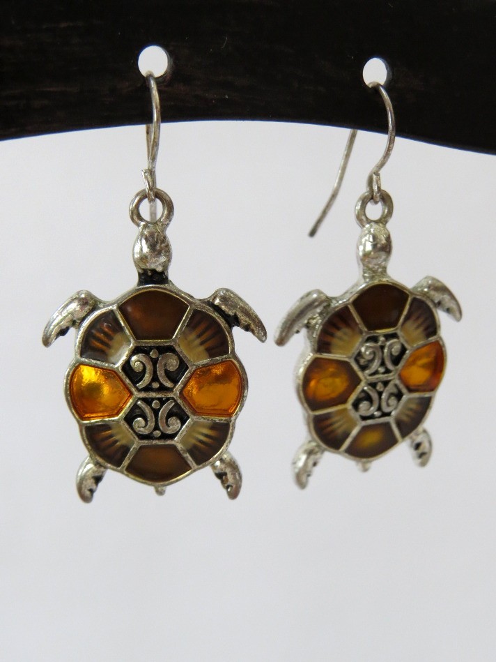 Cute sea turtle French wire dangle earrings with wonderful accented shell design. Measures 1 1/8" from the loop to the back leg and 3/4" from the outside of the front legs.