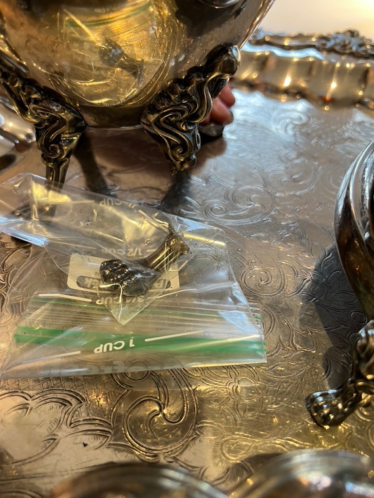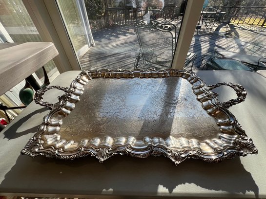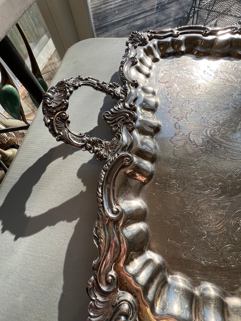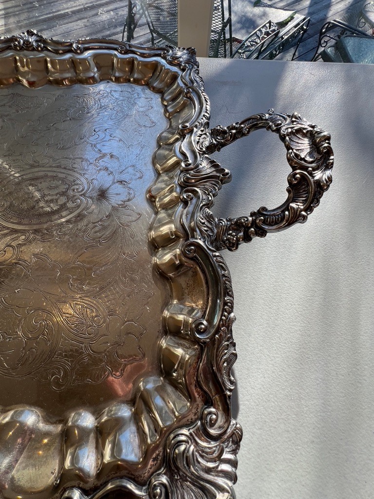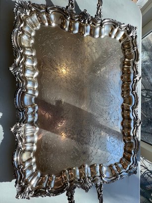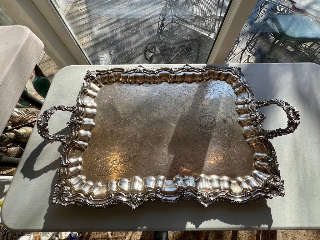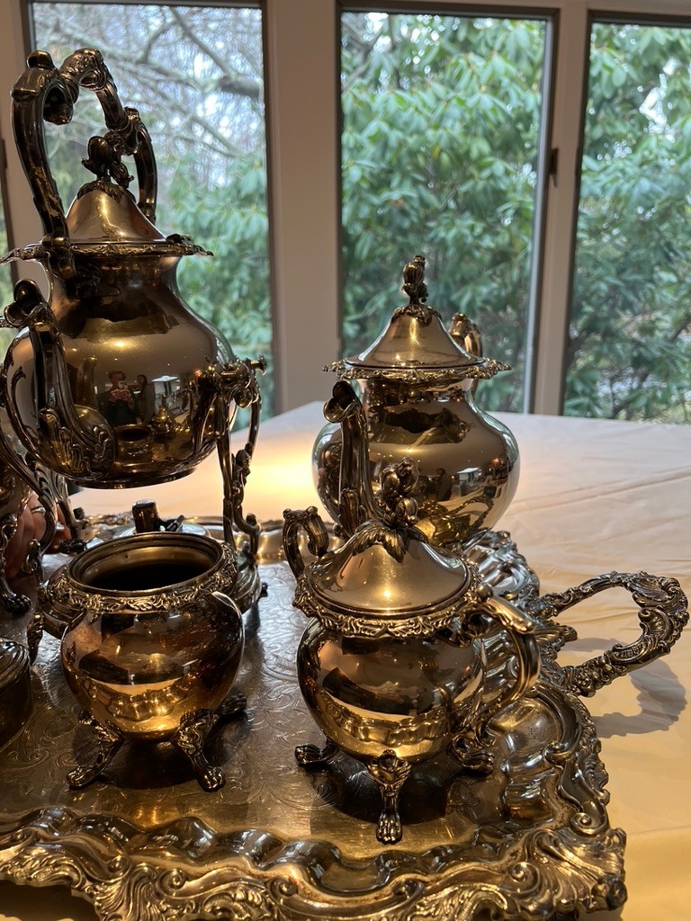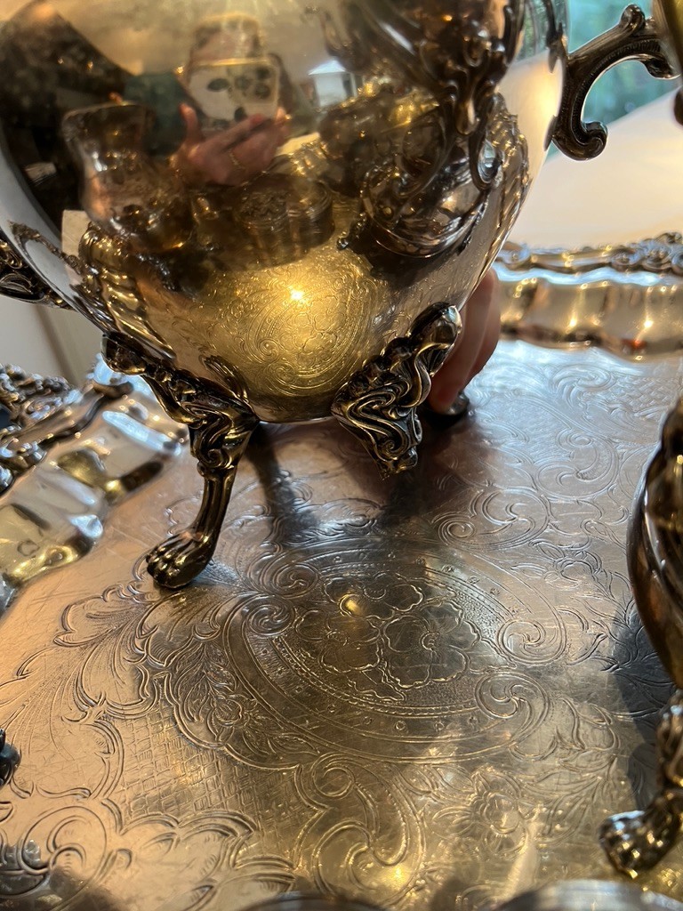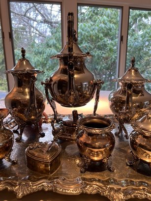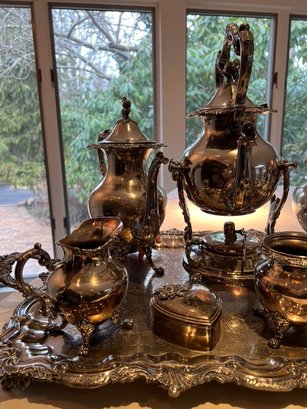 BEAUTIFUL, GENEROUS, silverplate tea service, SUPER set, including "spirit kettle", waste bin, sugar creamer, multiple pots, coffee and tea, Sheffield, silver on copper, tray measures 32" x 20"!!!