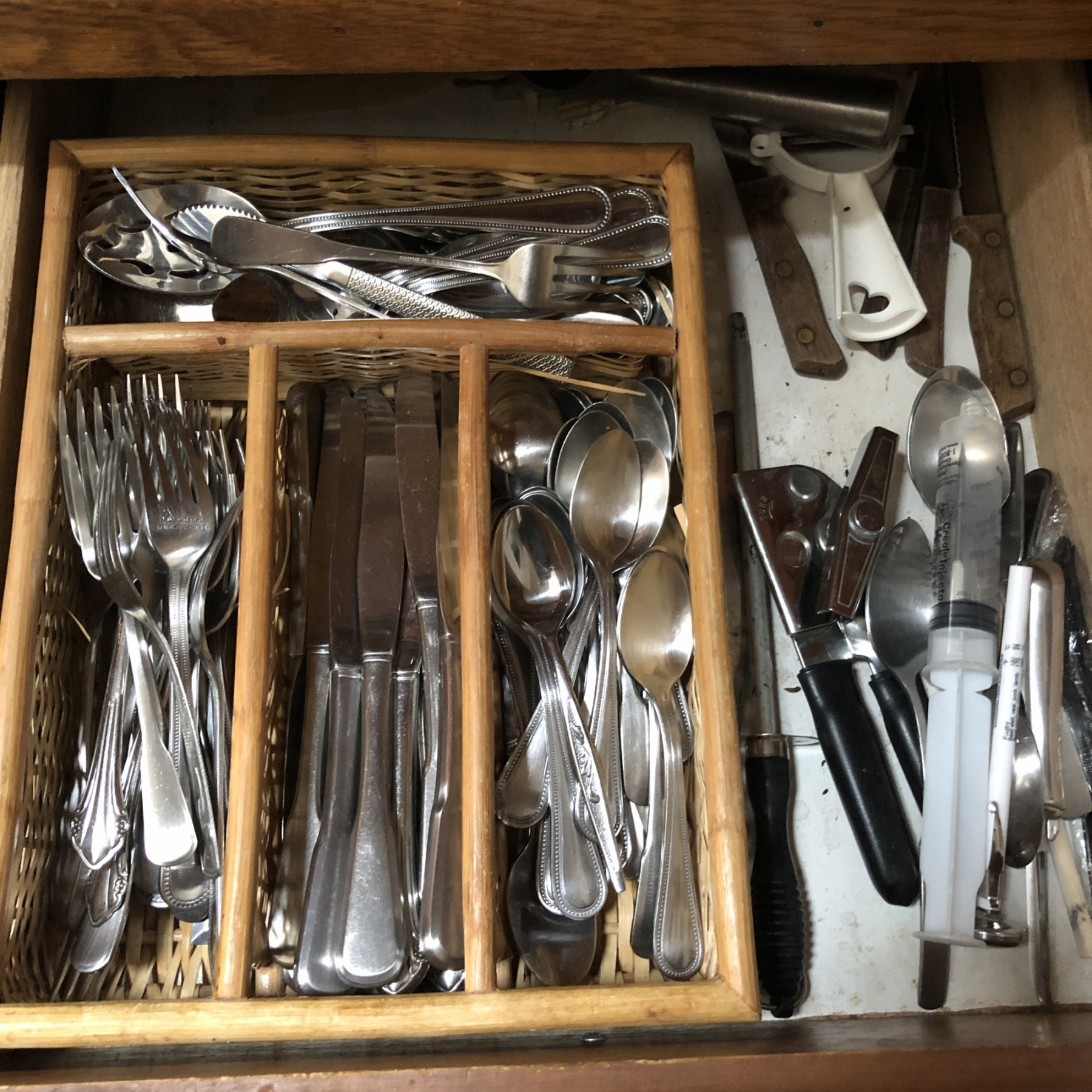Assorted silverware with a woven divider. Also includes some knives, an ice cream scoop and other items as shown.