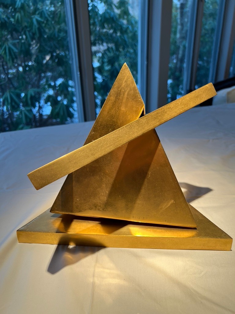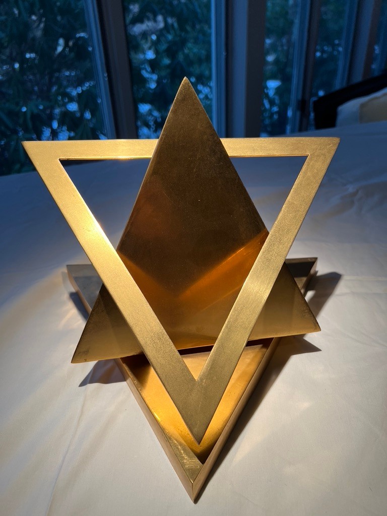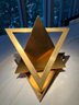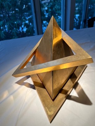 Simon Avissar brass rotating triangles, this is the 2nd of 2 in this sale, this being brighter brass, and having 2 levels to fixate the triangle for display.