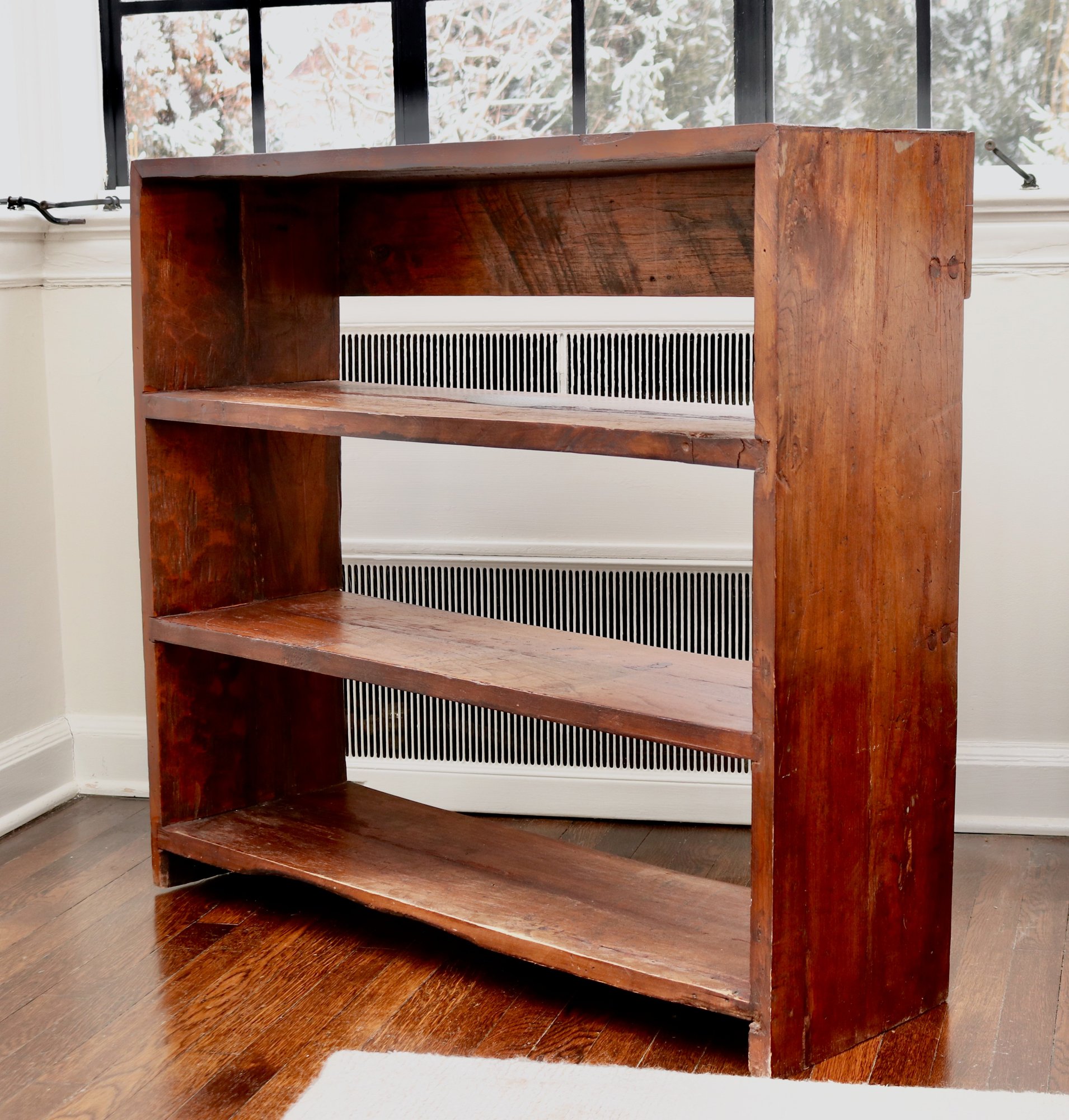 A charming rustic three-shelf bookcase, rich in character. Crafted from solid teak wood with a deep, warm patina, this piece showcases hand-hewn details, natural imperfections, and a well-loved surface that tells its own story. The open shelving offers versatile storage, ideal for displaying books, collectibles, or decorative accents. With its simple, rustic appeal and craftsmanship, this piece seamlessly blends into farmhouse, country, or vintage-inspired interiors.