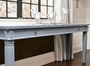 A stunning fusion of traditional craftsmanship and modern sophistication, this imported painted teak console from Singapore exudes refined classic charm. It embodies a transitional style with influences of neoclassical and colonial design. The light blue-grey finish highlights its elegant profile, featuring fluted square legs, subtle molding details, and hand-carved accents at each corner. Two drawers with antiqued brass ring pulls provide storage, while the sturdy teak construction ensures lasting durability. Whether styled in an entryway, behind a sofa, or as a statement writing desk, this piece offers a versatile and chic touch to any interior.