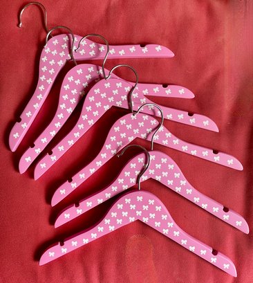 Such nice wooden pink hangers with little white bows painted on. They are well made with metal hooks and indents for narrow straps. They are in excellent condition and measure 12" long by 7 1/2" tall.