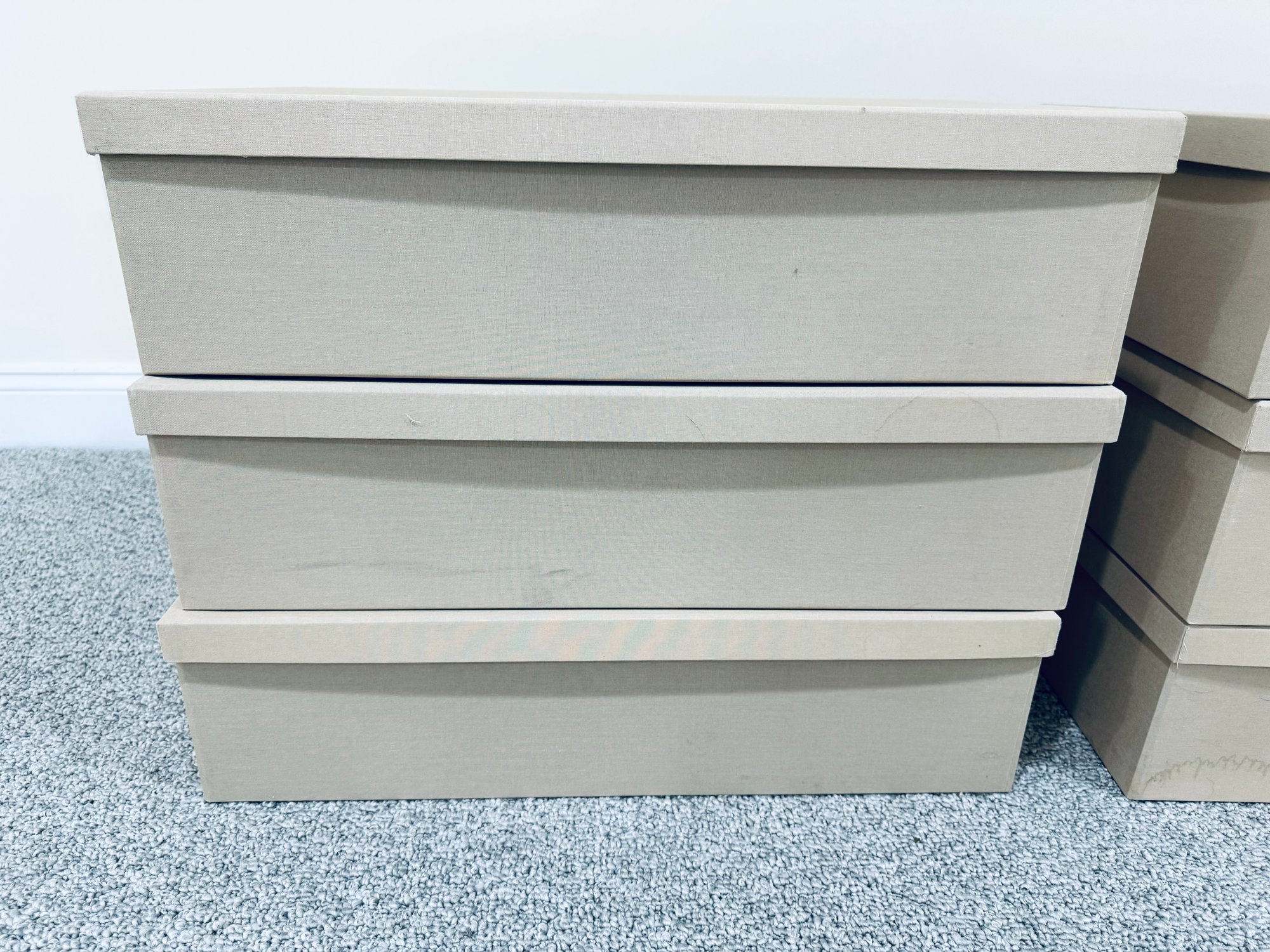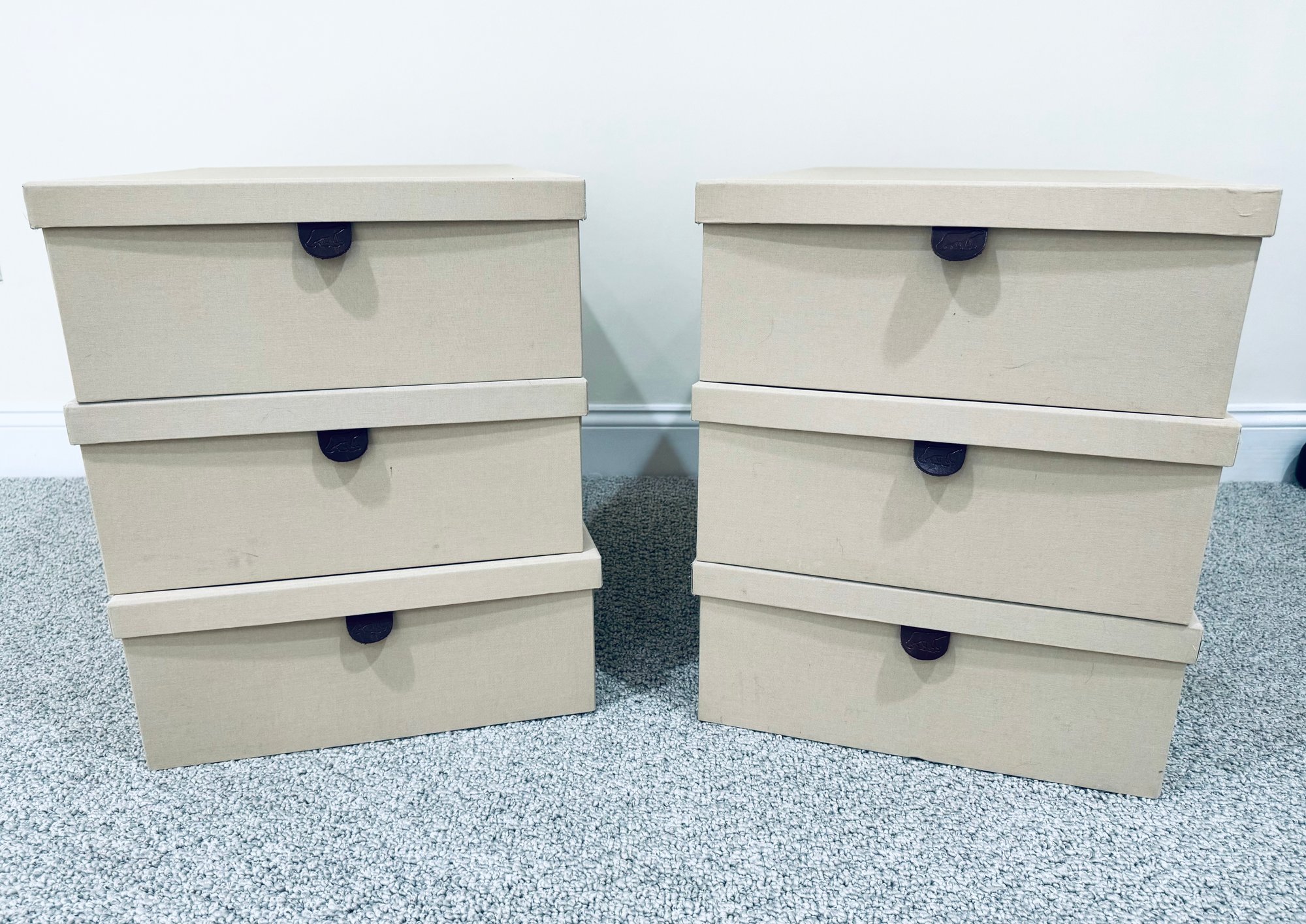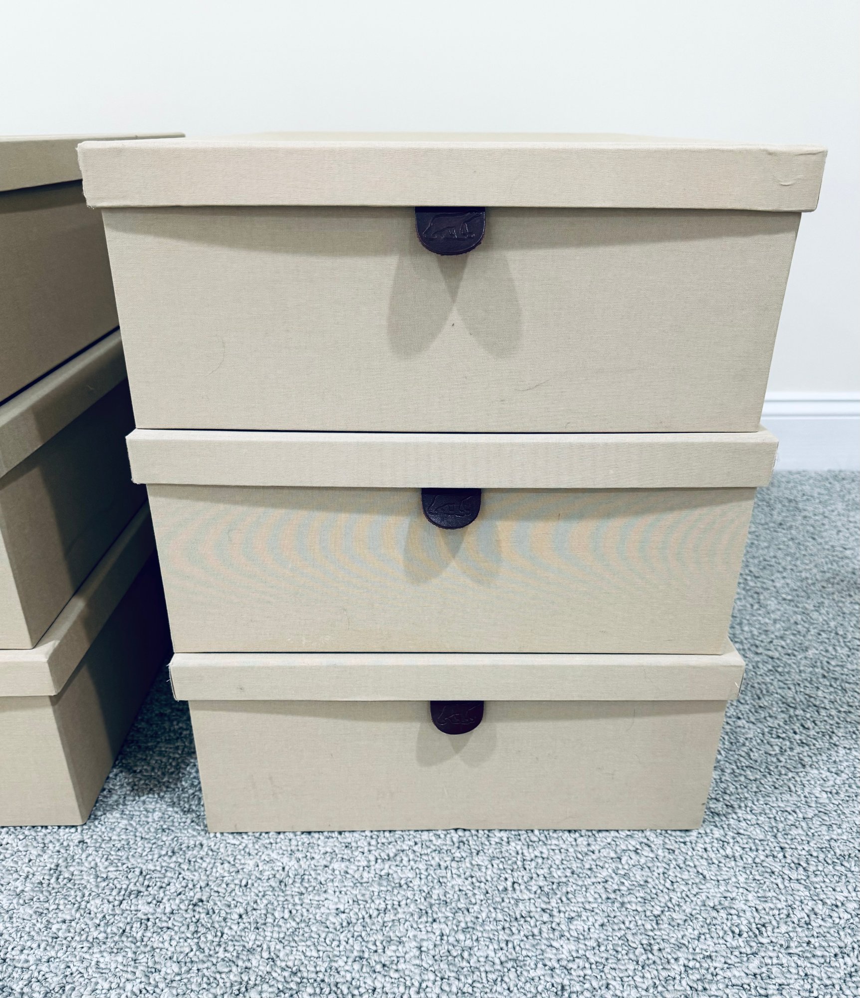 Six long cardboard storage boxes covered in a beige canvas with leather pulls. Condition is overall very good as we’re never used. There are some marks on the exterior of a few of the boxes see all photos . All inside are new.