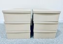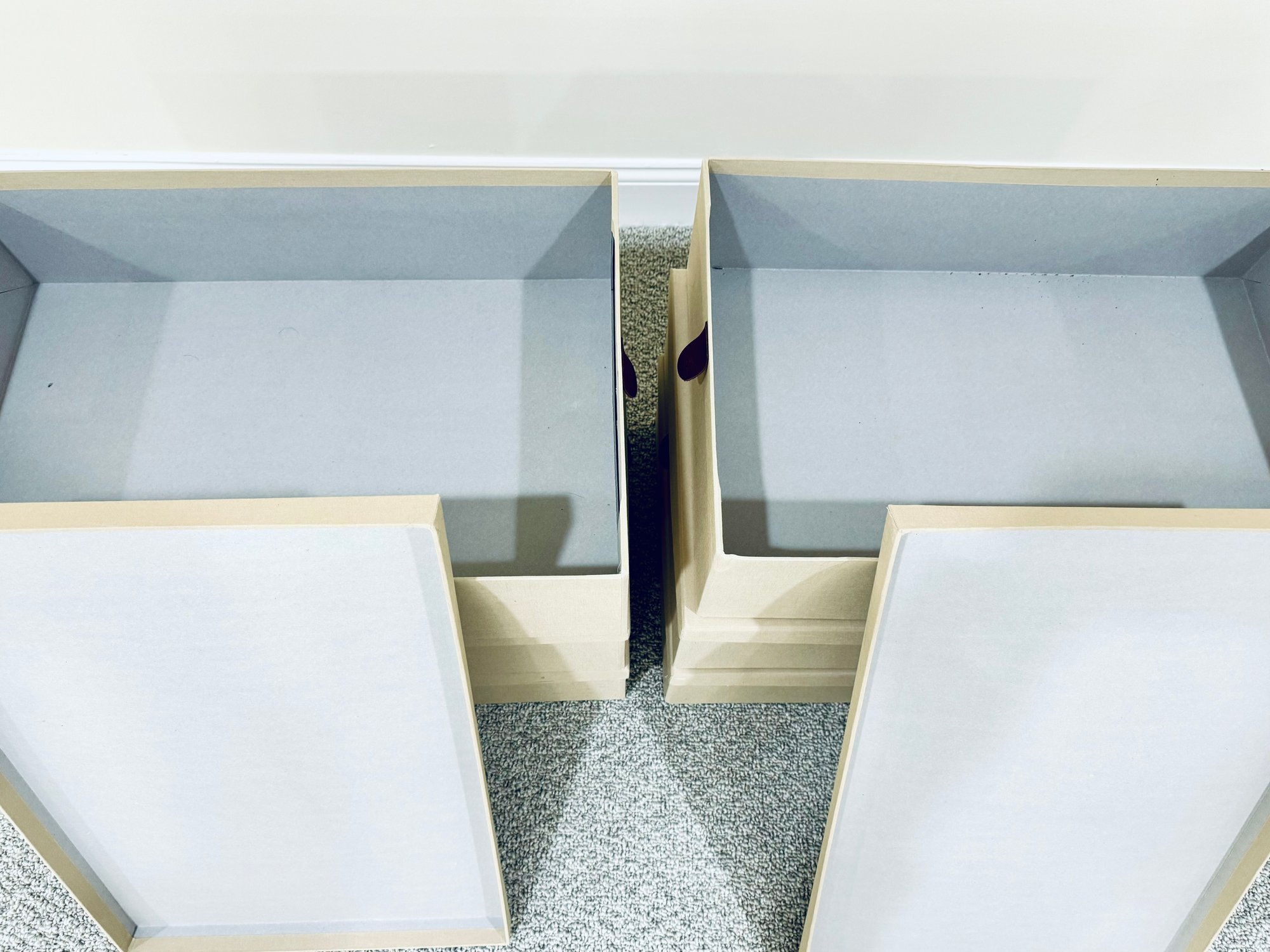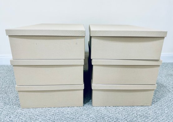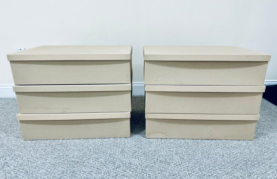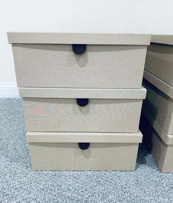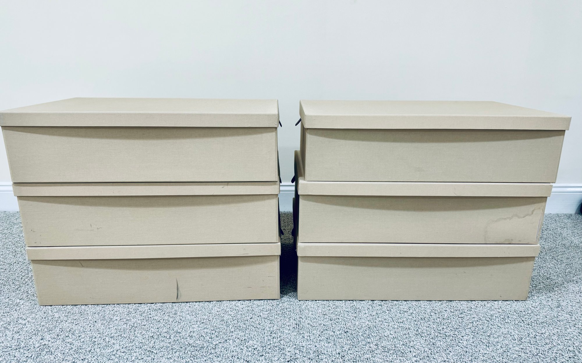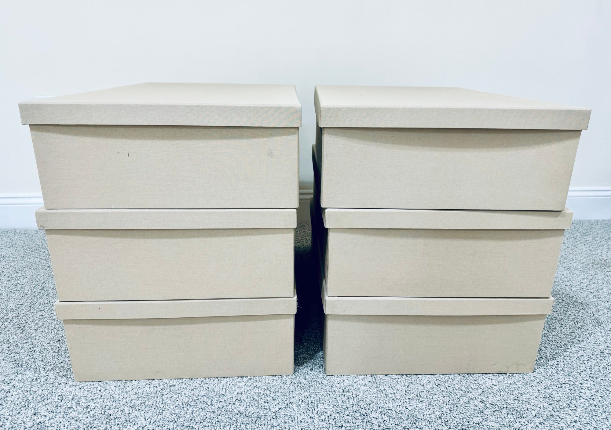 Six long cardboard storage boxes covered in a beige canvas with leather pulls. Condition is overall very good as we’re never used. There are some marks on the exterior of a few of the boxes see all photos . All inside are new.