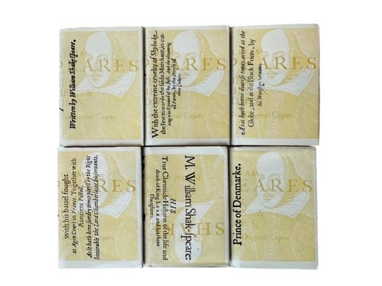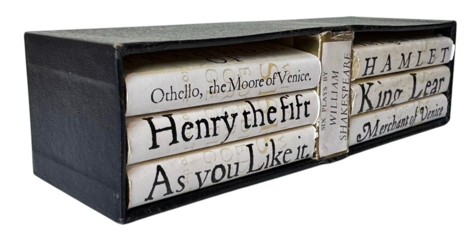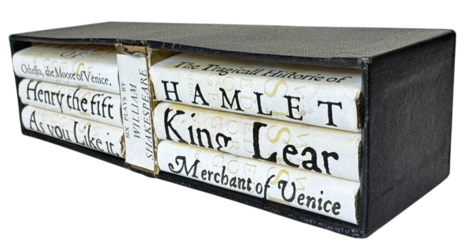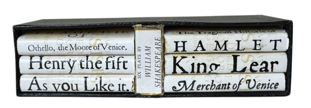 A charming boxed set of six miniature volumes by William Shakespeare, housed in their original black presentation case. Each volume features gilt page edges and decorative cream bindings with stylized typography to the spines.