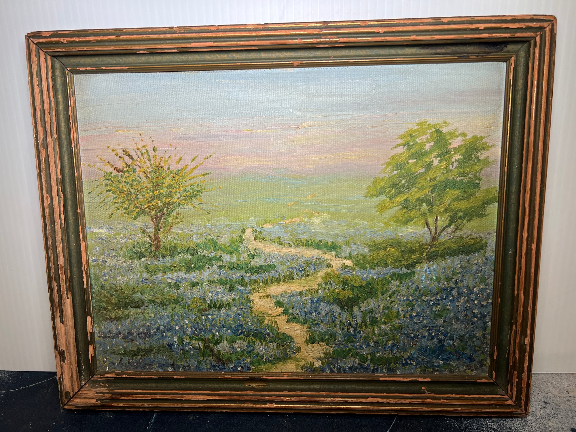 Small original oil painting of a landscape with a winding path up the center and fields of bluebells on either side.